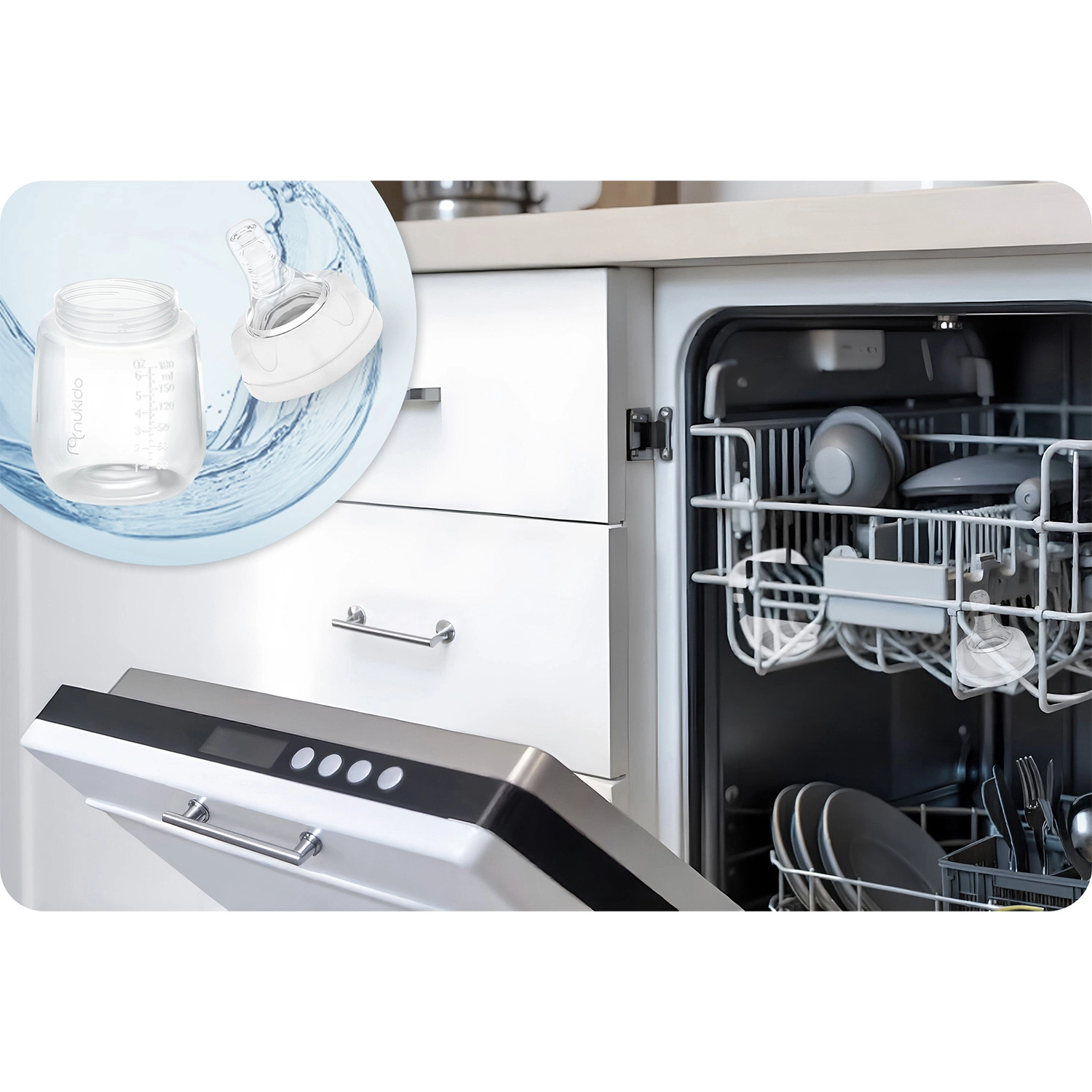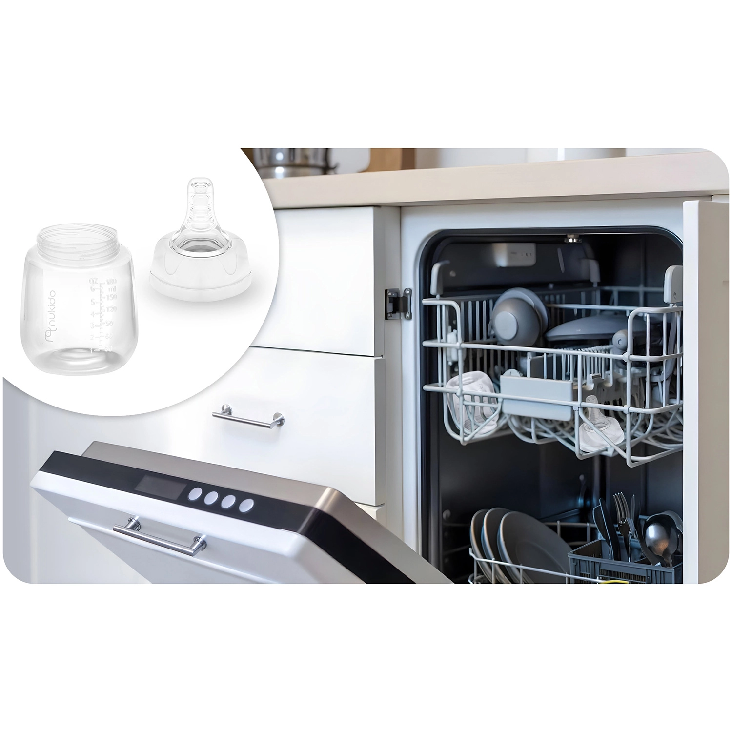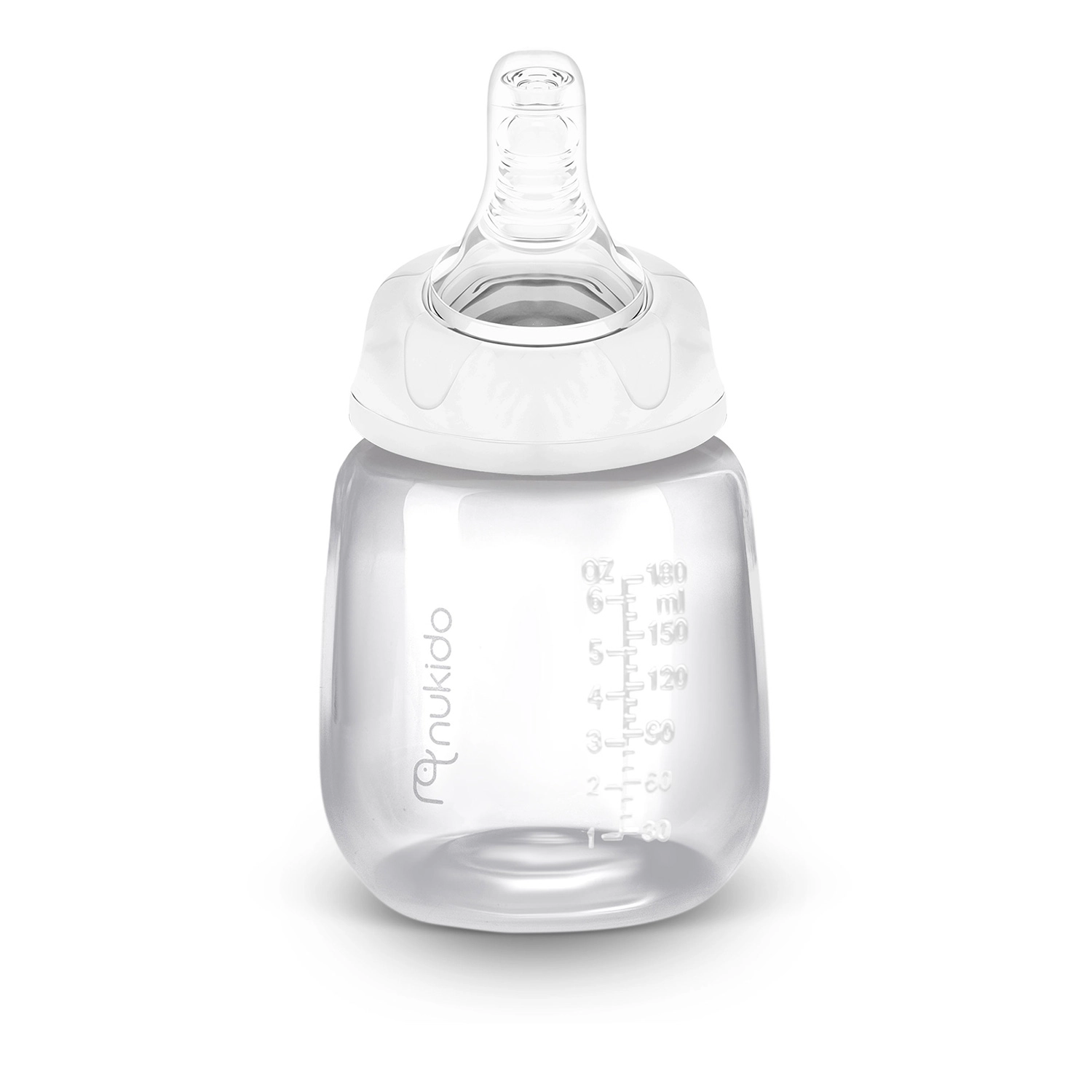 De NUKIDO-set bevat twee duurzame, herbruikbare flesjes van 180 ml, gemaakt van licht en onbreekbaar polypropyleen. Dankzij de wijde hals gaat vullen en reinigen snel en hygiënisch, terwijl de duidelijke maatstrepen nauwkeurig doseren mogelijk maken. Inclusief dopjes en lekdichte sluitingen, zodat melk of voeding veilig kan worden bewaard en meegenomen.
