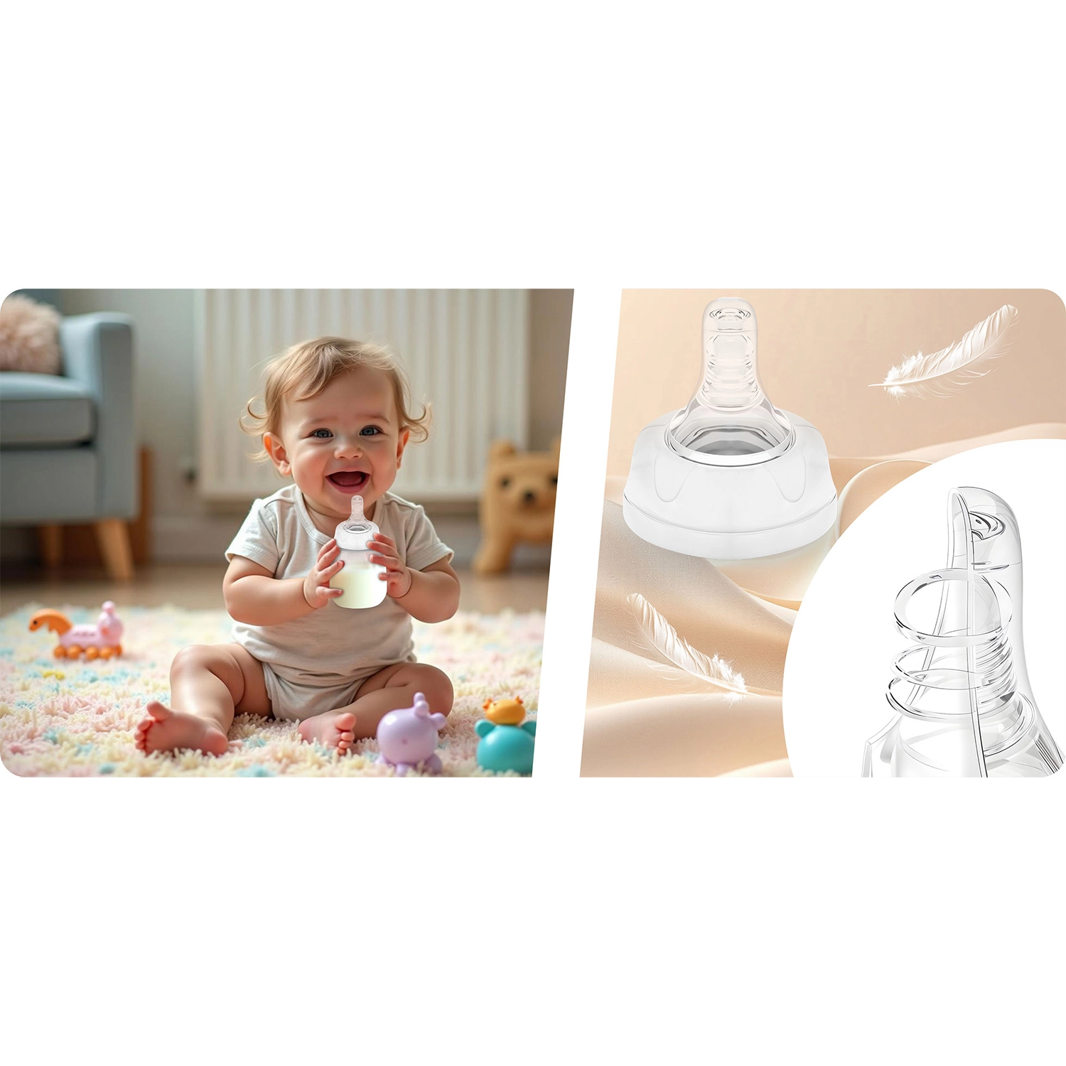 De brede, zachte speen met ventilatiegroeven bootst de tepel na, ondersteunt de juiste ontwikkeling van de mondholte en helpt tepel-speenverwarring te voorkomen.