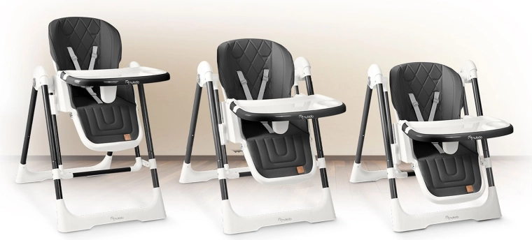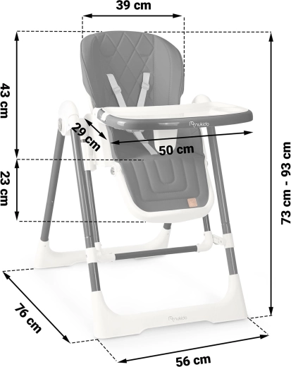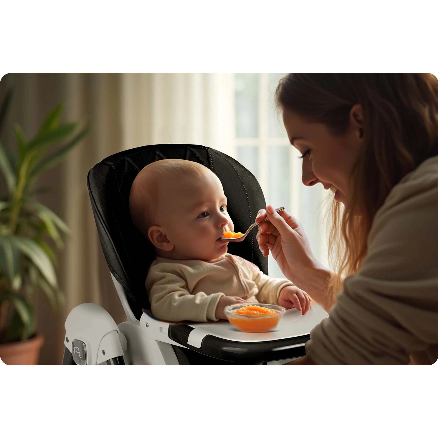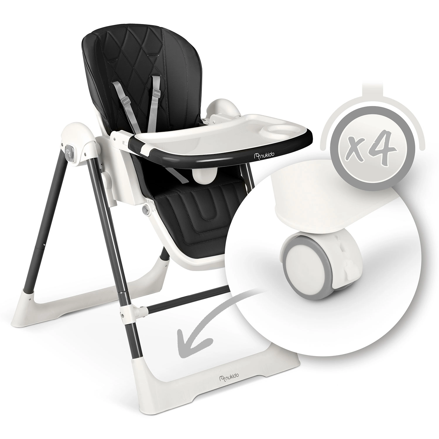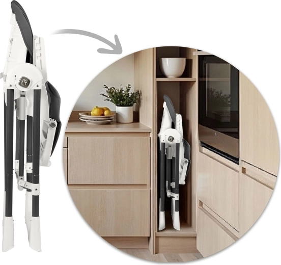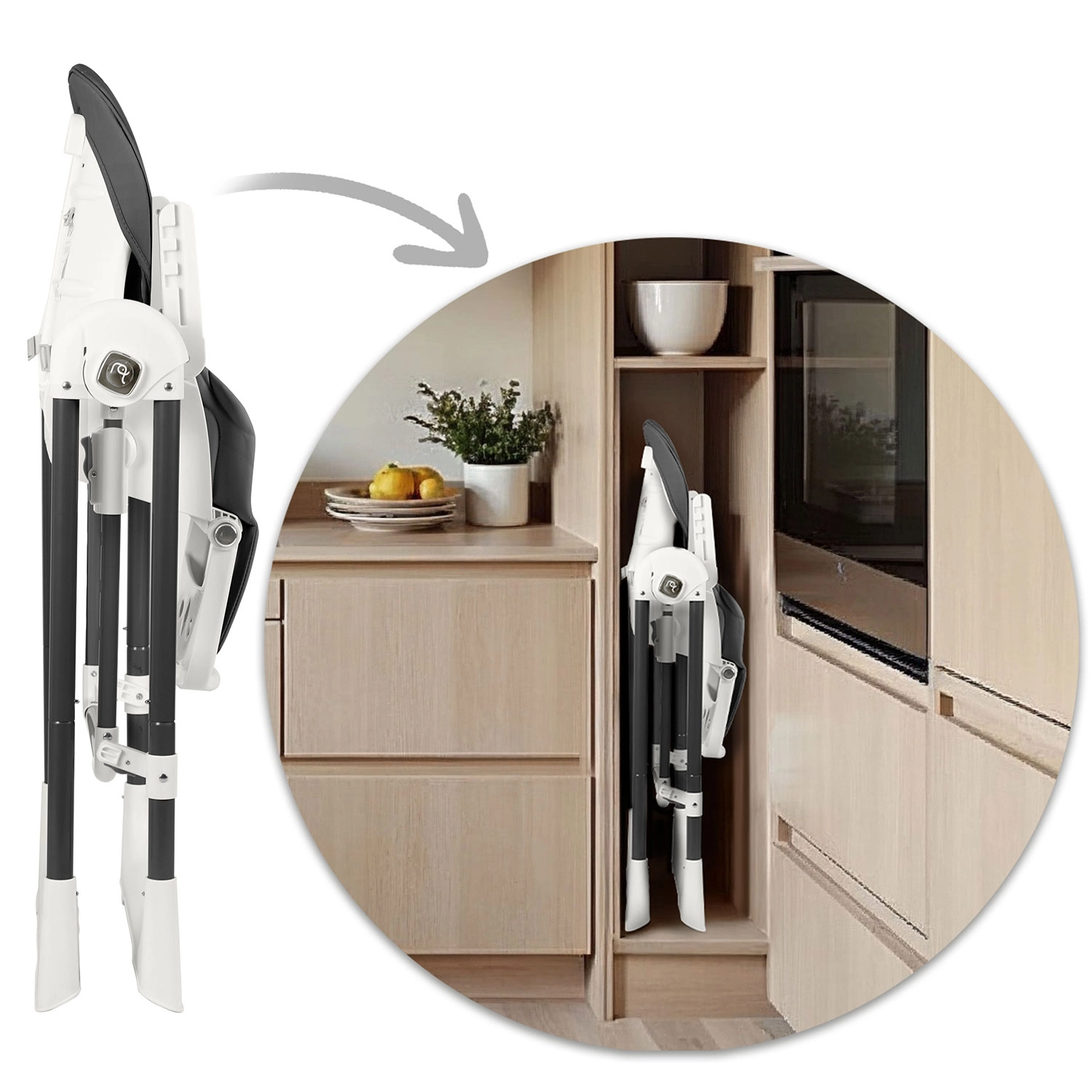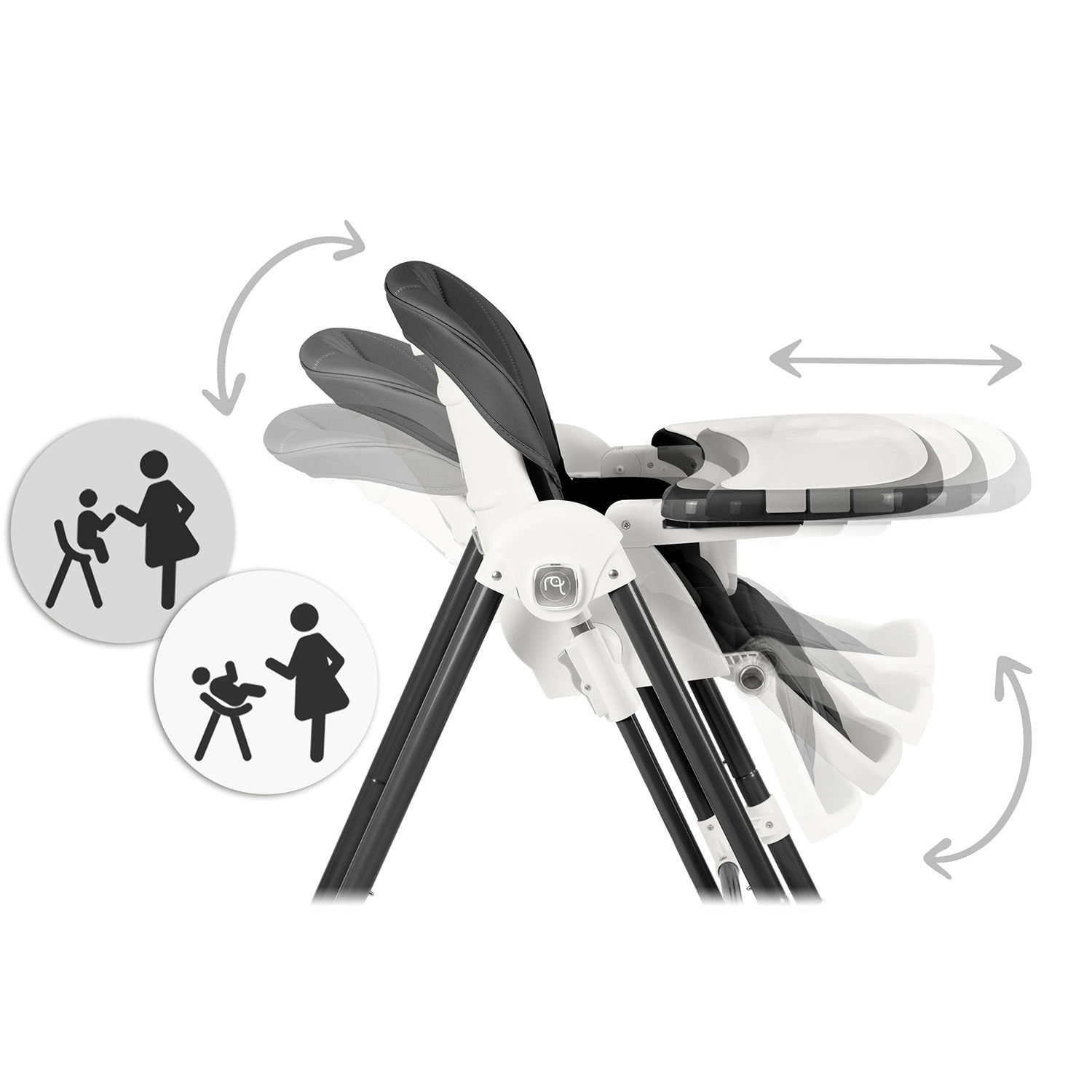 Het praktische afneembare blad met bovenste inzet is snel te verwijderen en af te spoelen; de zachte bekleding is gemakkelijk af te nemen. De 5-punts gordels houden je kind veilig, brede poten met antislipdoppen zorgen voor stabiliteit. Na het eten vouw je de stoel eenvoudig op tot compacte afmetingen en dankzij de wieltjes verplaats je hem moeiteloos naar waar je hem nodig hebt.