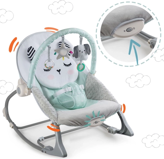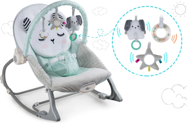 De afneembare speelboog met knisperende pluchen speeltjes ondersteunt de ontwikkeling van zicht en tast. Zachte, huidvriendelijke hoezen zorgen voor comfort en kunnen eenvoudig worden verwijderd en met de hand gewassen. De stabiele constructie met een metalen frame en de mogelijkheid om het schommelen te vergrendelen breidt het gebruik van het ligstoeltje uit volgens de actuele behoeften.