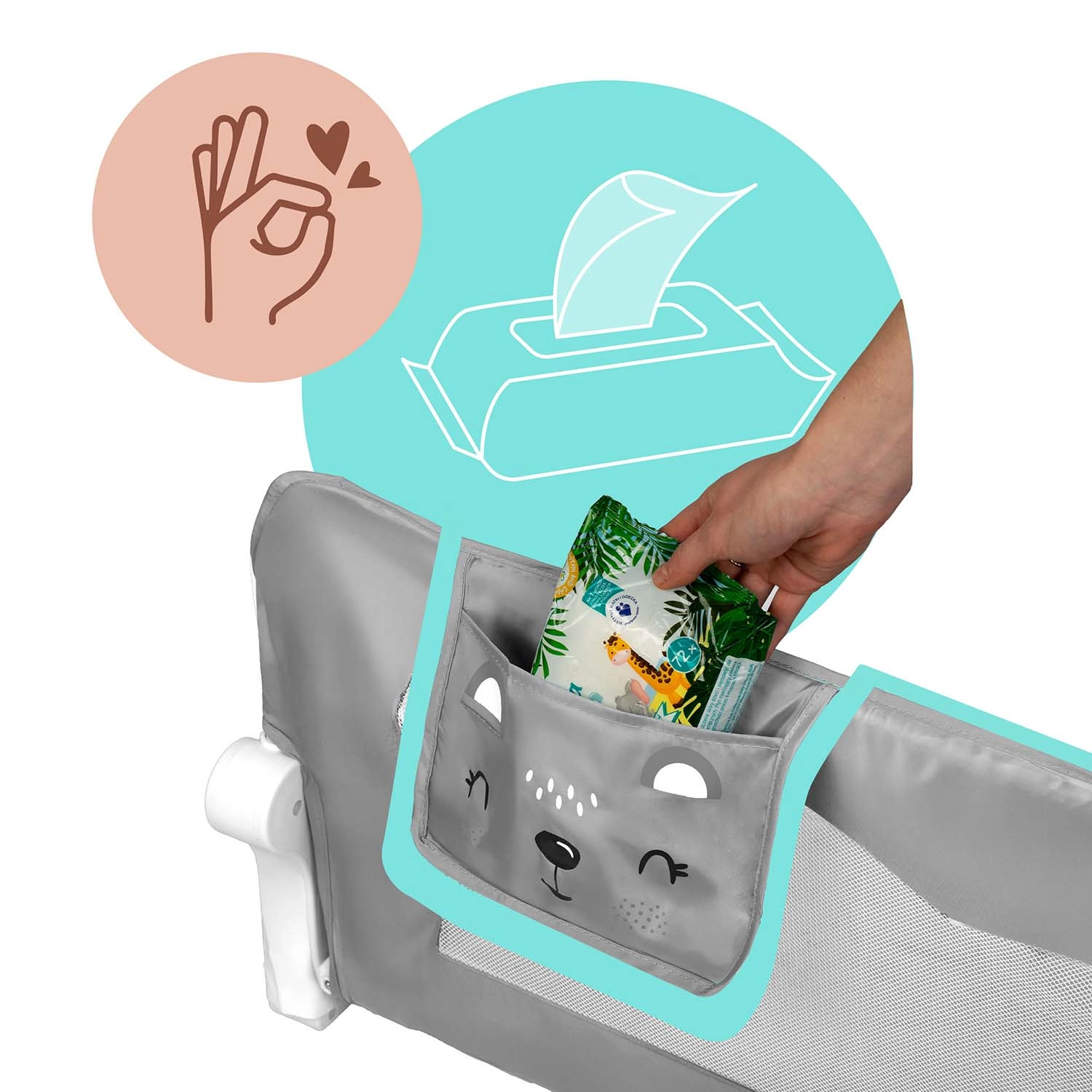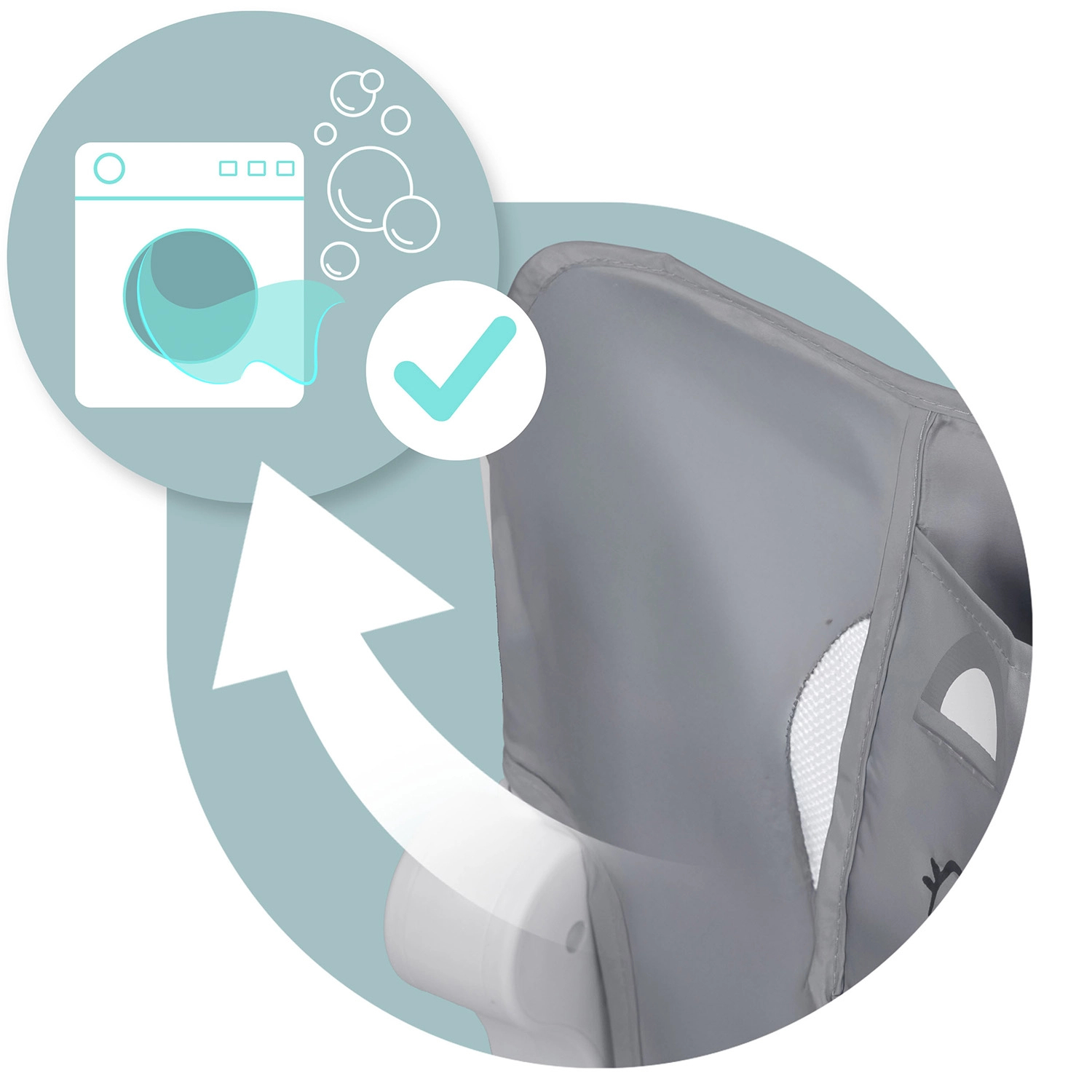 Meshpanelen zorgen voor luchtcirculatie en zicht op het kind. De hoes is eenvoudig afneembaar en wasbaar.