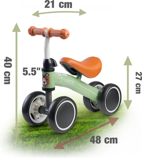 Stabiele kinderloopfiets met vier wielen voor veilige eerste stapjes richting fietsen. Biedt een duurzaam metalen frame, een zacht zadel van foam, lichtgewicht constructie en rubberen handvatten met stoppers voor een zekere grip. Ideaal voor de ontwikkeling van evenwicht, coördinatie en concentratie, zowel binnen als buiten.