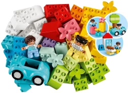 LEGO DUPLO Box met blokken is de ideale startset voor de allerkleinste bouwers. De set bevat 65 kleurrijke onderdelen, waaronder een autootje met bewegende wielen, ramen, een dak, bloemen, een baguette, DUPLO-figuren en stenen met de cijfers 1–3. De robuuste opbergdoos maakt opbergen en meenemen eenvoudig, en de grote, veilige onderdelen stimuleren creativiteit, fijne motoriek en ruimtelijk inzicht.