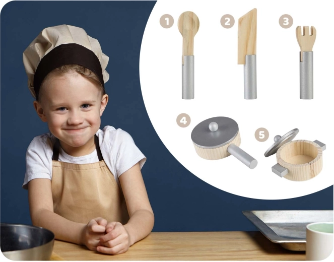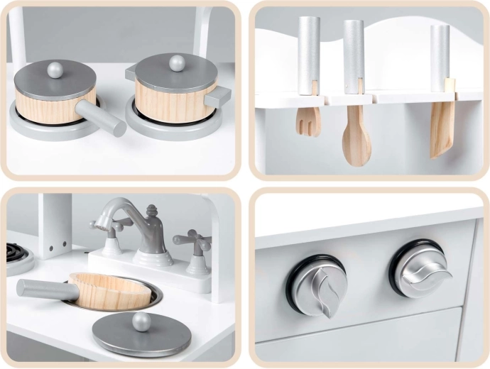 Ontdek de kwalitatieve houten kinderkeuken in elegant wit, die de fantasie en creatieve spel stimuleert. Voorzien van draaibare sensorische knoppen, een magnetron met kleurrijk paneel, een uitneembare gootsteen met kraan en deurtjes met magneetsluiting. Inclusief pannen en keukengerei – alles voor urenlang veilig en leuk speelplezier.