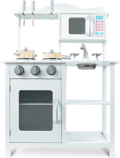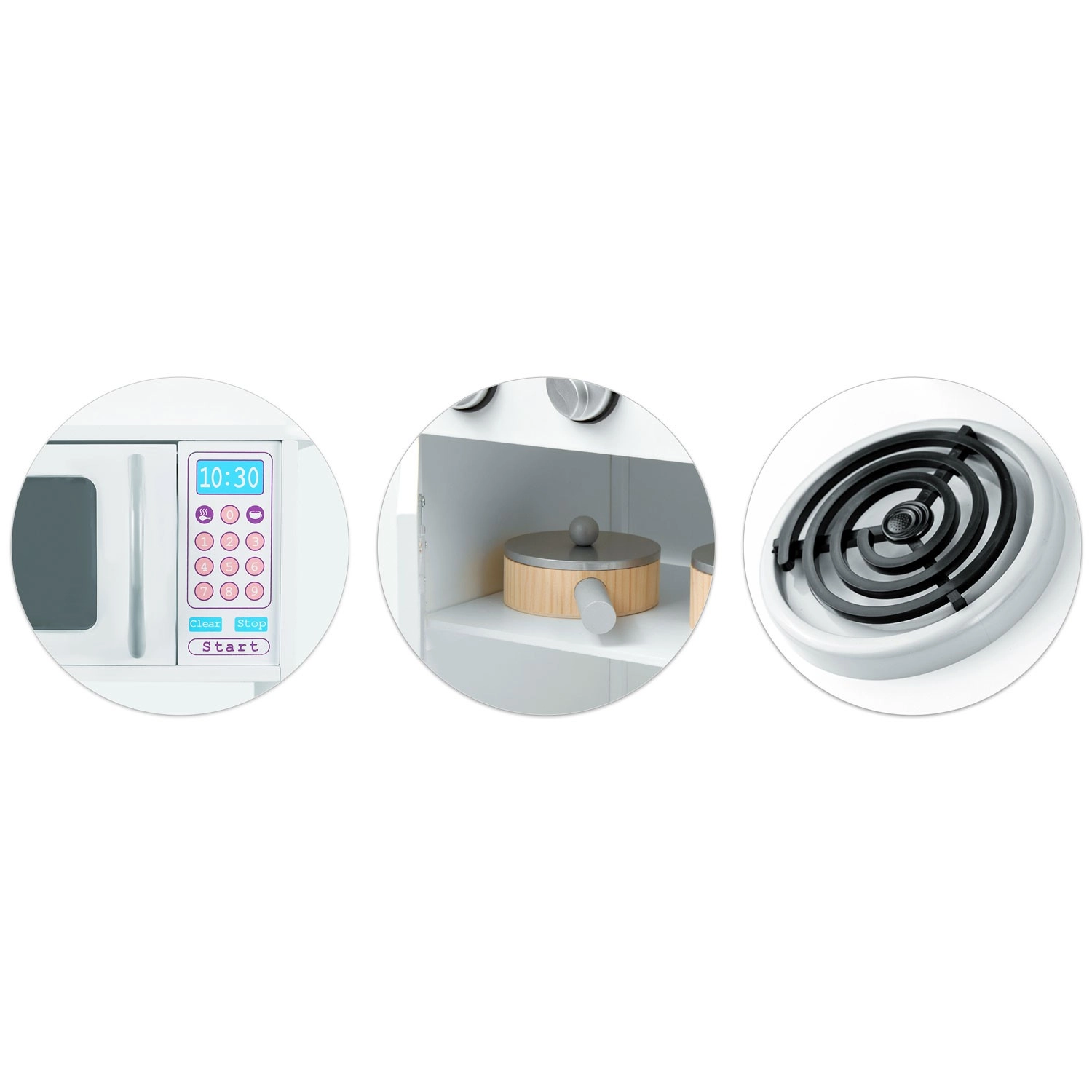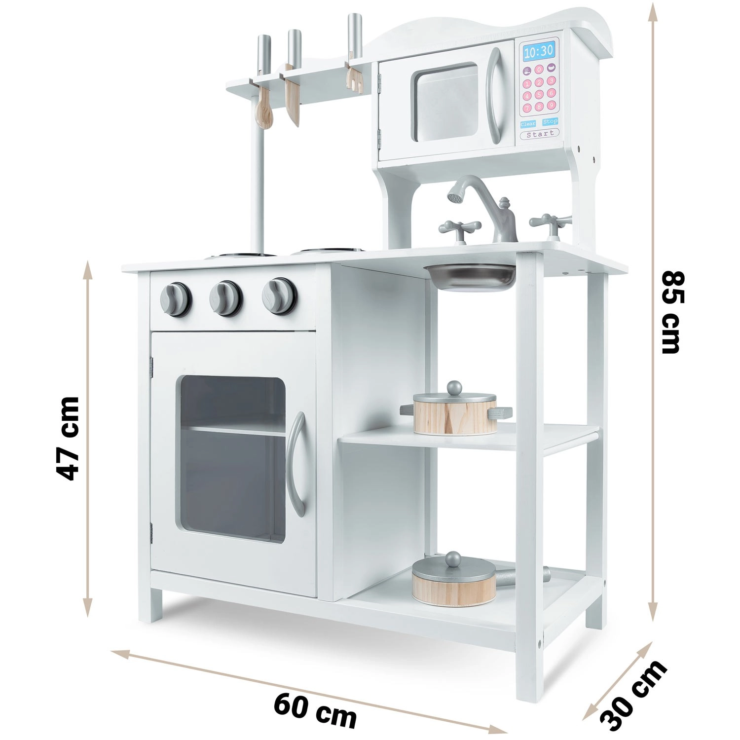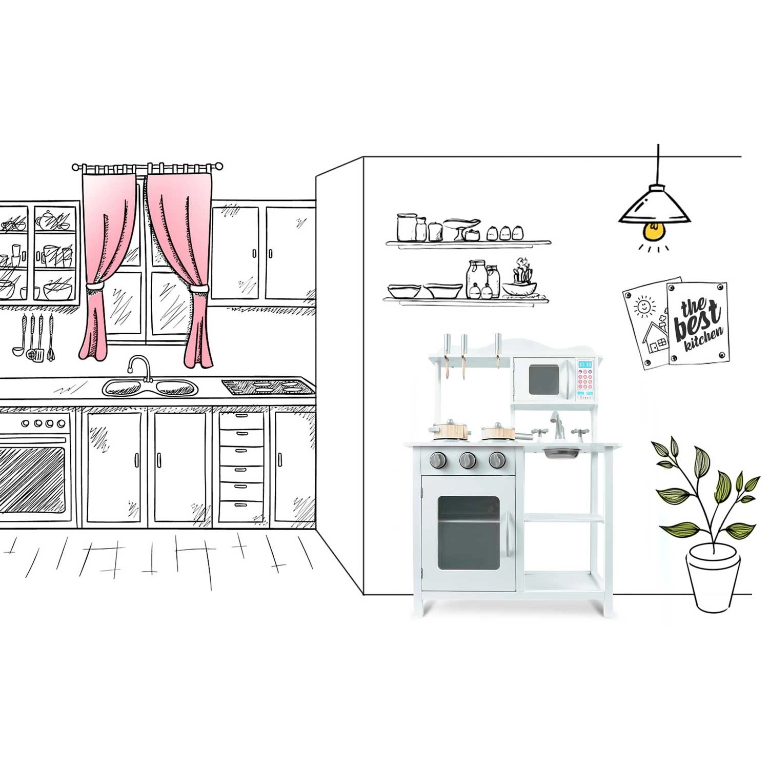 Deze stijlvolle houten keuken in universeel wit past perfect in elke kinderkamer. Realistische elementen zoals kookpitten met draaiknoppen, een magnetron met kleurrijk paneel en een oven met plank stimuleren rollenspel en leren kinderen de basis van koken en organiseren.