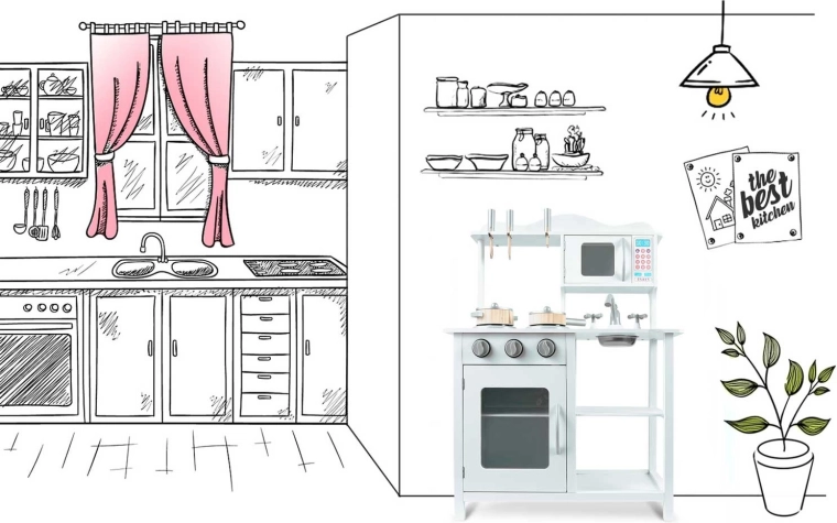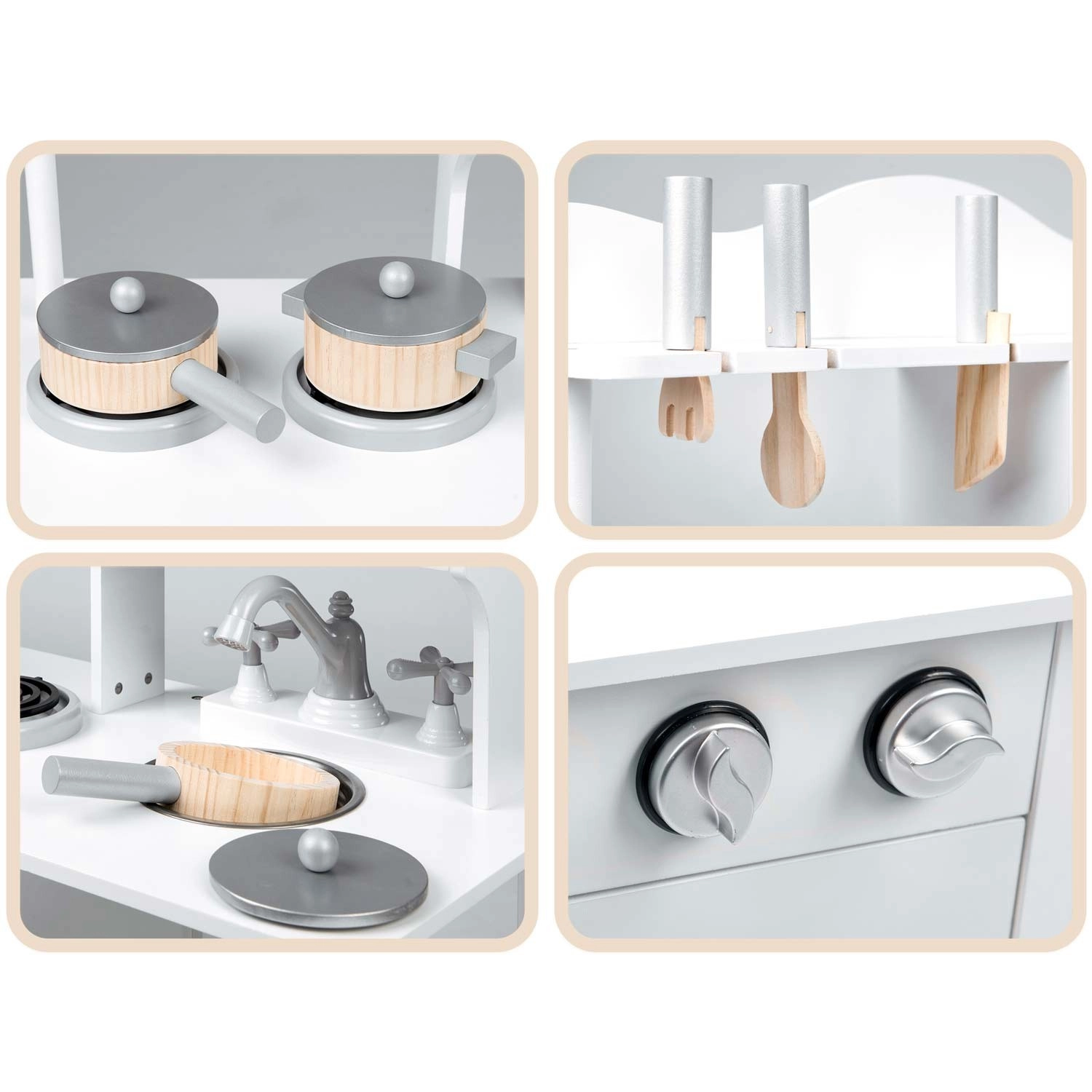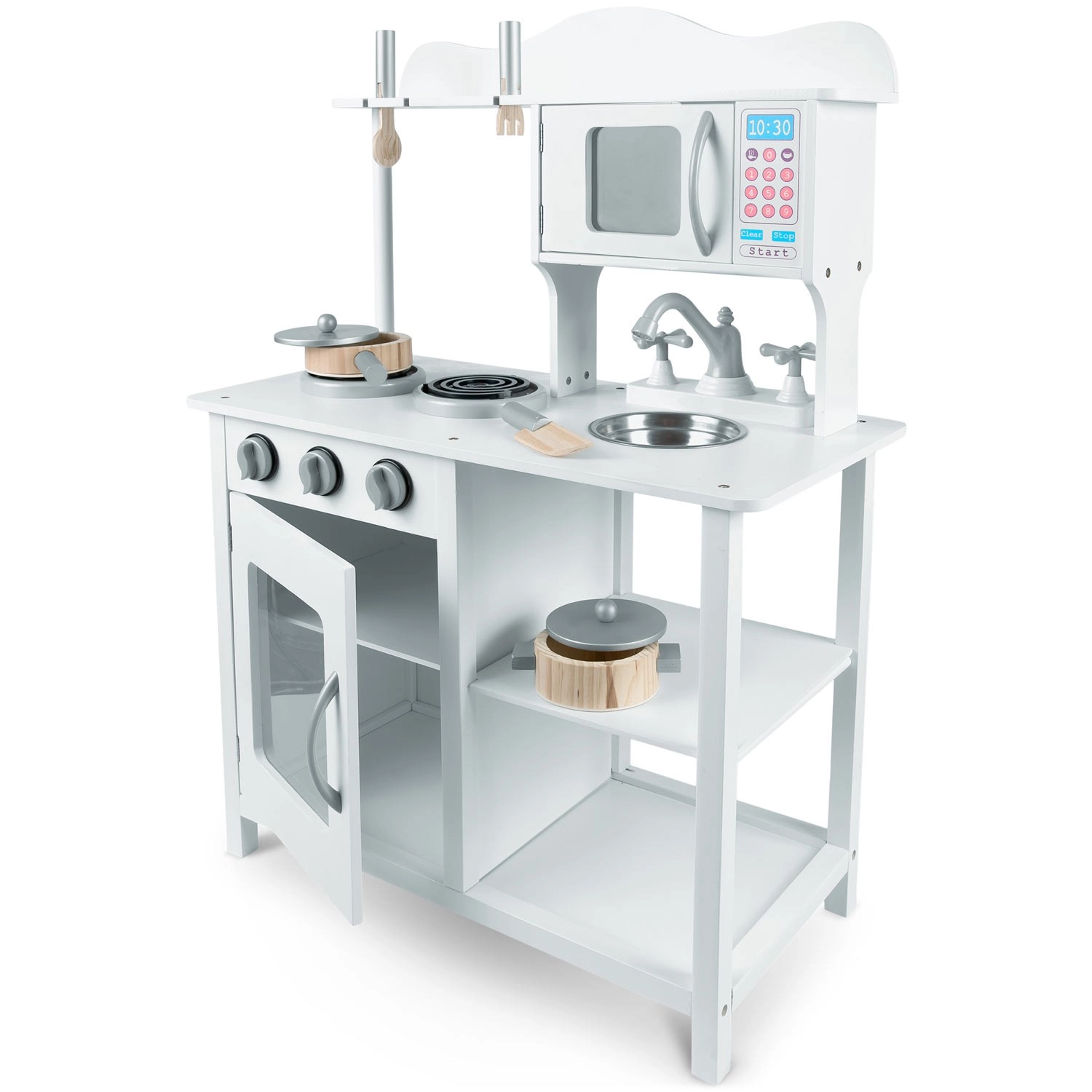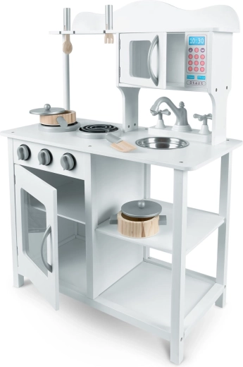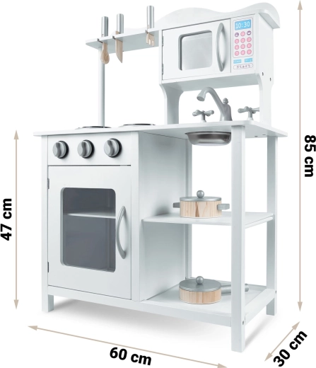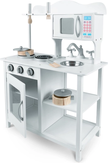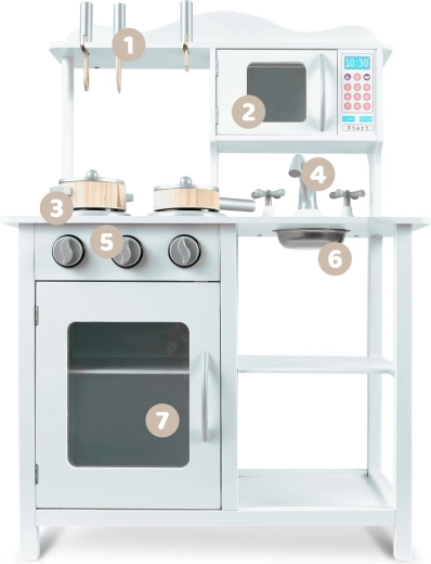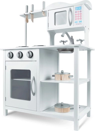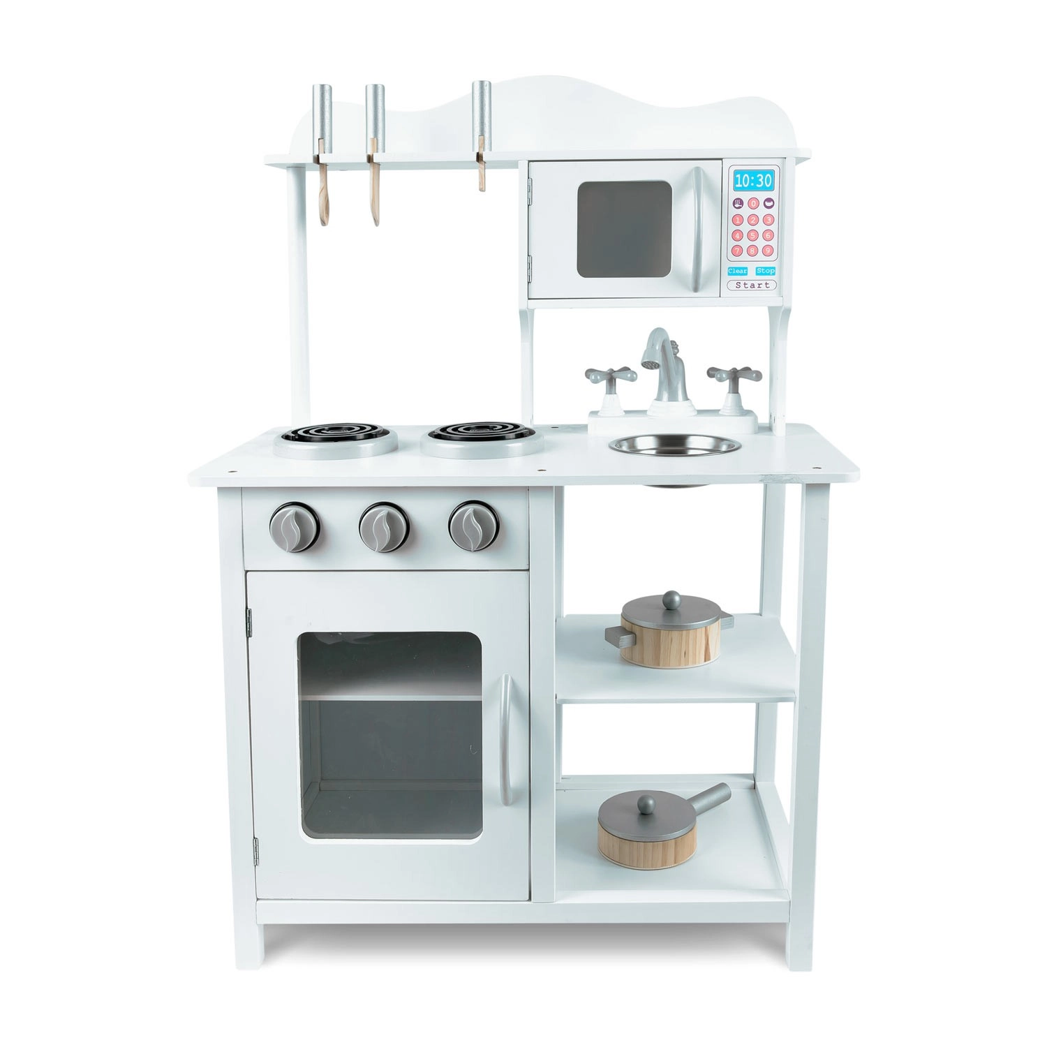 Deze stijlvolle houten keuken in universeel wit past perfect in elke kinderkamer. Realistische elementen zoals kookpitten met draaiknoppen, een magnetron met kleurrijk paneel en een oven met plank stimuleren rollenspel en leren kinderen de basis van koken en organiseren.