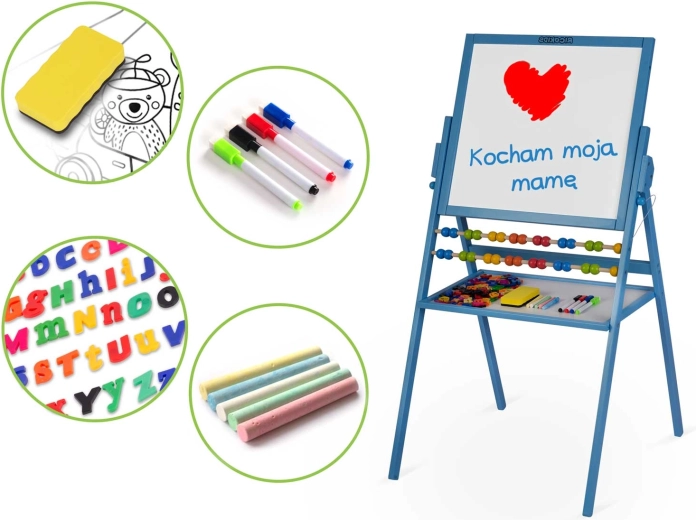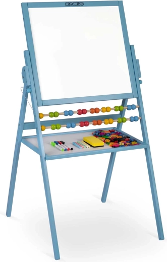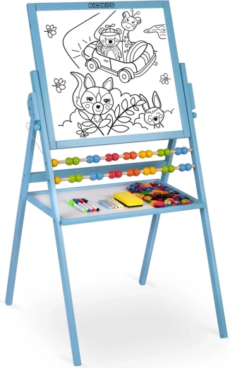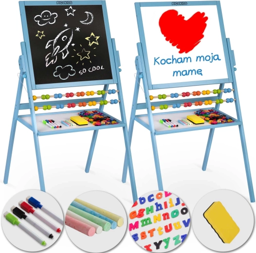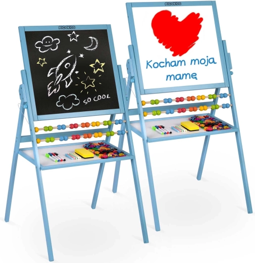 Groot, multifunctioneel kinderbord van RICOKIDS met een krijtbord en een magnetisch whiteboard in één draaibaar frame. Dankzij het stabiele houten frame, de geïntegreerde telraam en de uitgebreide set accessoires (krijtjes, stiften, wisser, magnetische letters en cijfers) stimuleert het creativiteit, leren en spel – alles veilig en met CE, EN 71-certificering.