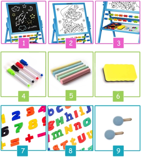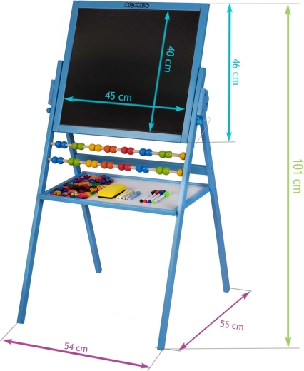 Het draaibare ontwerp combineert een krijtbord voor creatief tekenen en een magnetisch whiteboard voor schrijven met uitwisbare stiften en werken met magnetische letters en cijfers.