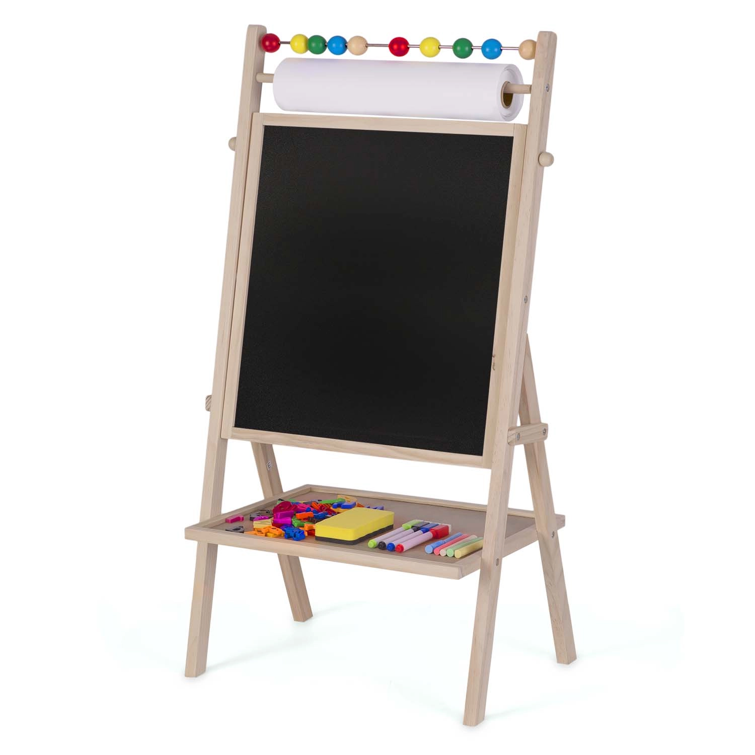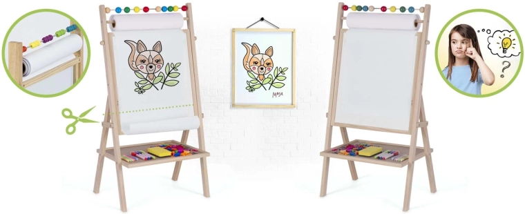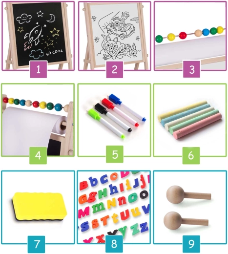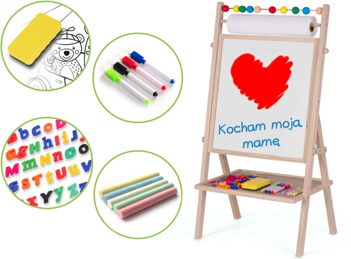 Ontdek het creatieve centrum voor kleine kunstenaars en schoolkinderen: het stabiele houten RICOKIDS-bord combineert een magnetisch whiteboard en een krijtbord in één, aangevuld met een papierrol van 20 m, een telraam en een uitgebreide set accessoires voor leren en plezier.