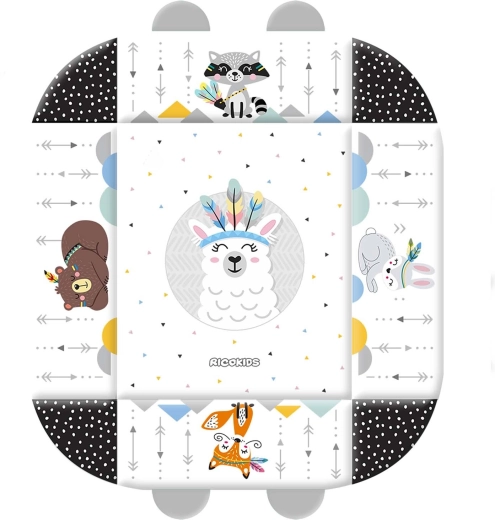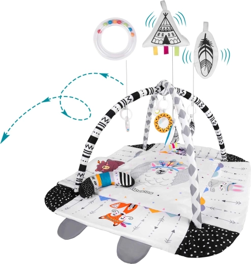 De RICOKIDS Boho speelmat 110 × 100 cm creëert een knus en veilig nest voor dagelijks ontdekken. Twee gekruiste speelbogen met afneembare hangspeeltjes (rammelaars, bijtspeeltjes, spiegeltje) ondersteunen visuele tracking, oog-handcoördinatie en fijne motoriek. Zachte vulling en opstaande randen zorgen voor comfort en bescherming tijdens het spelen, terwijl contrasterende en dierlijke motieven voor visuele stimulatie zorgen.