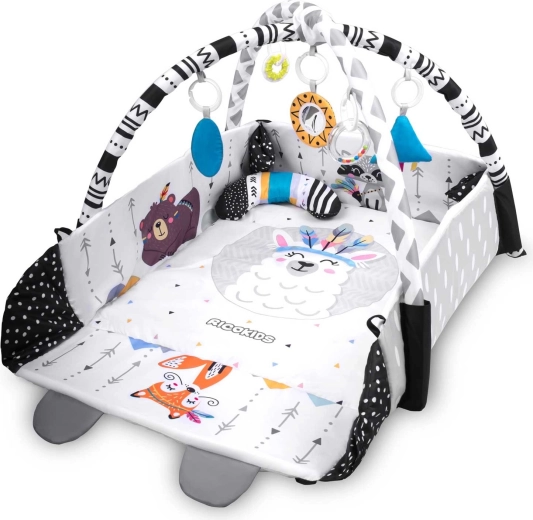 - 3-in-1 flexibel gebruik – open speelmat, knus nest met opstaande randen of speelcentrum met bogen.
