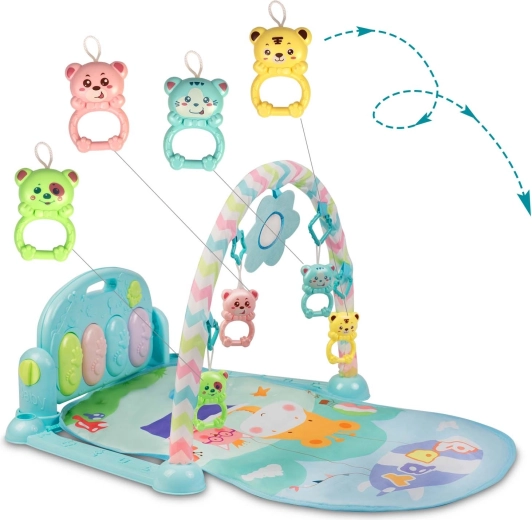 De interactieve speelmat met piano Ricokids 3-in-1 is een ideale keuze voor de eerste maanden en de daaropvolgende ontwikkelingsfases. De kleurrijke mat met boog en hangspeeltjes nodigt uit om de armpjes te heffen, te grijpen en tegen het pianootje met 12 melodieën te schoppen. De spiegel bevordert zelfherkenning, rammelaars en knisperende elementen stimuleren gehoor en tast. Dankzij de afneembare piano kan de mat eenvoudig worden omgevormd tot een muziektafeltje voor een zittend kind.