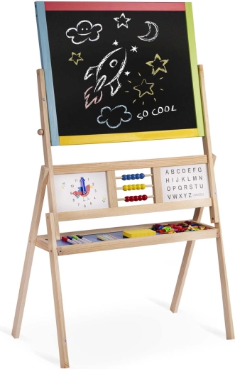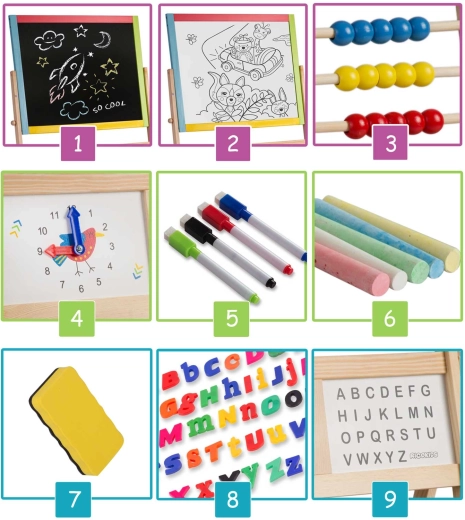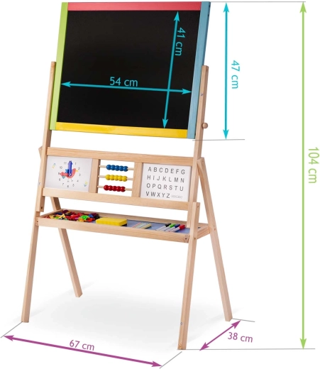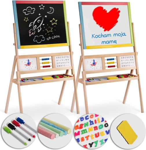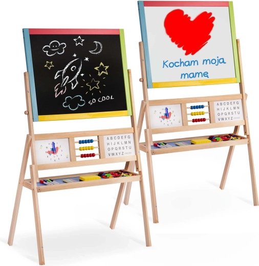 Ontdek het grote dubbelzijdige bord voor kinderen van Ricokids, dat een krijtbord- en magnetisch oppervlak in één combineert. Dankzij de stabiele constructie, draaibare plaat, lesklok, telraam en een uitgebreide set accessoires is het de ideale tool voor leren en creatieve pret.
