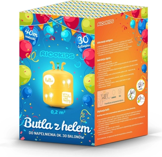 Draagbare wegwerp heliumfles van Ricokids met een inhoud van 0,20 m³, inclusief 30 gekleurde ballonnen en 40 m decoratief lint voor snel en eenvoudig opblazen. Ideaal voor verjaardagen, bruiloften en kinderfeestjes – creëer binnen enkele minuten een sfeer vol kleur en plezier.