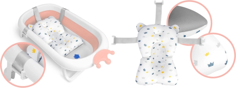 Het badje vouwt snel plat tot een hoogte van ca. 10 cm, is gemakkelijk op te bergen en te vervoeren – zet het naast een kast, schuif het op een plank of neem het mee in de auto. Het zachte kussentje met verstelbare banden geeft uw baby comfortabele ondersteuning, is uitneembaar en eenvoudig te reinigen. Hoogwaardige materialen en nauwkeurige afwerking voldoen aan de strenge Europese veiligheidsnormen.