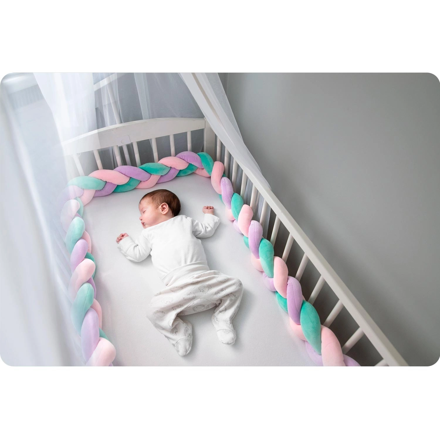 De gevlochten bedbumper van Ricokids creëert voor je baby een zachte en knusse omgeving. Dikke gevlochten strengen dempen stoten tegen de spijlen, voorkomen dat handjes vast komen te zitten en zorgen voor een rustigere slaap. Dankzij de combinatie van mint, roze en paars is het een stijlvolle toevoeging aan elk ledikant en elke kinderkamer.