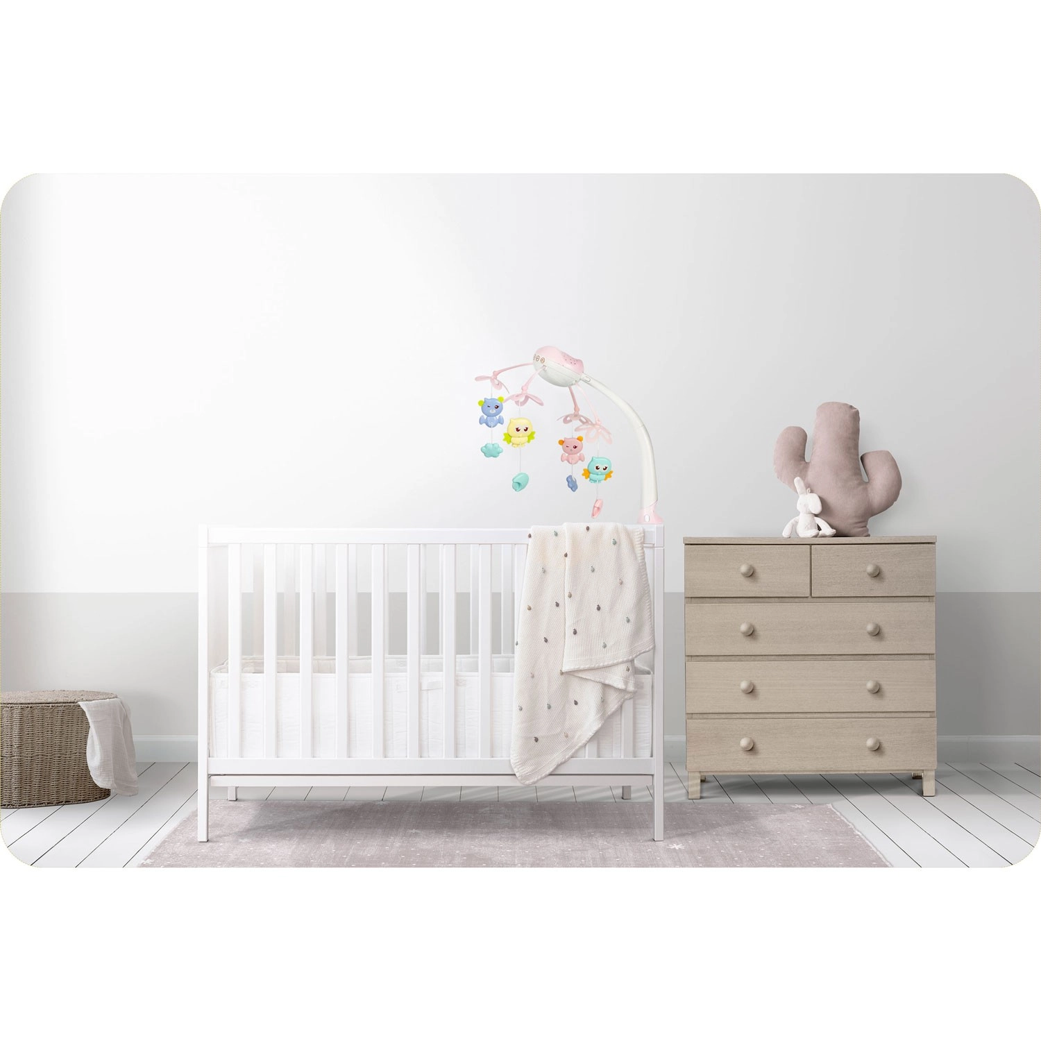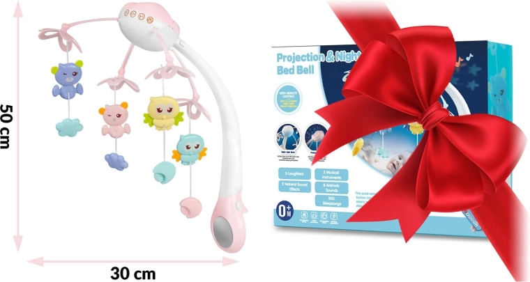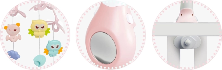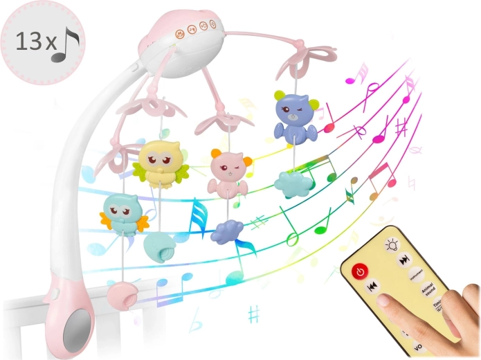 Stel je baby gerust met zachte beweging, licht en muziek. Deze roze mobiel voor boven het babybed combineert draaiende hangspeeltjes, een nachtlampje met sterrenprojector en een afstandsbediening voor maximaal gemak voor ouders. Biedt 13 melodieën, een timer van 10/20/30 min en een veilige, stabiele bevestiging op de meeste babybedjes.