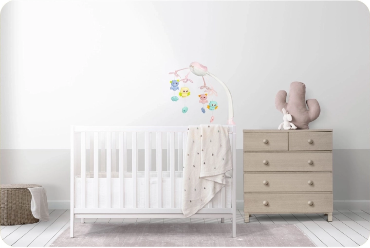 De bediening is eenvoudig – gebruik de afstandsbediening om melodieën, lichtstanden en timer te wisselen, of gebruik de knoppen op de unit. De universele schroefklem zorgt voor een snelle en stabiele montage op de meeste bedframes. Dankzij de subtiele kleuren past de mobiel in elke babykamer.