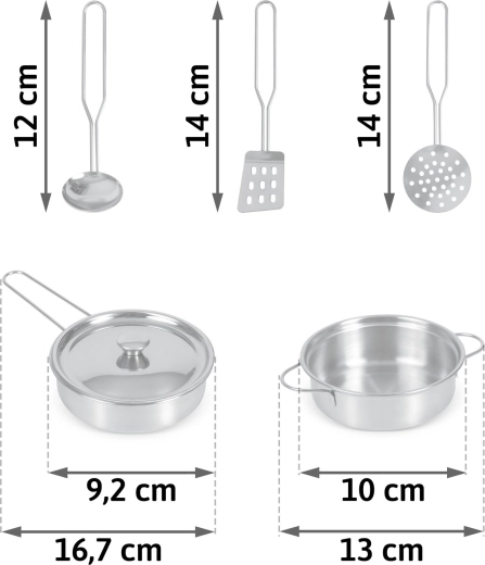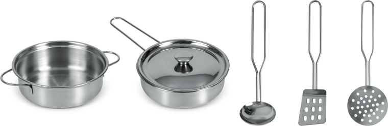 Inhoud van de set: een kleine pan met handgrepen, een steelpan met deksel en lange handgreep, een soeplepel, een geperforeerde spatel en een geperforeerde lepel/vergiet. De metalen accessoires zijn duurzaam, eenvoudig te onderhouden en passen perfect bij kinderkeukens, inclusief modellen van het merk RICOKIDS.