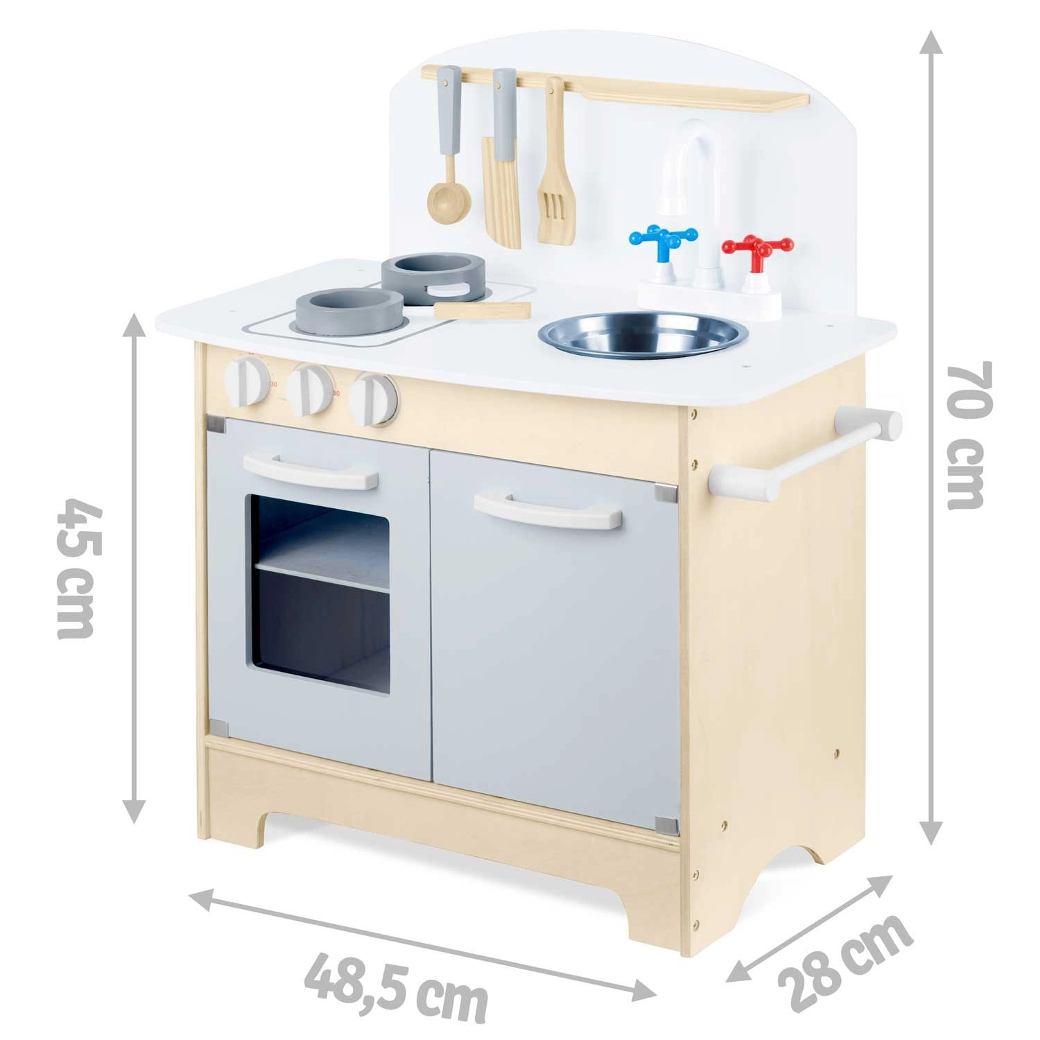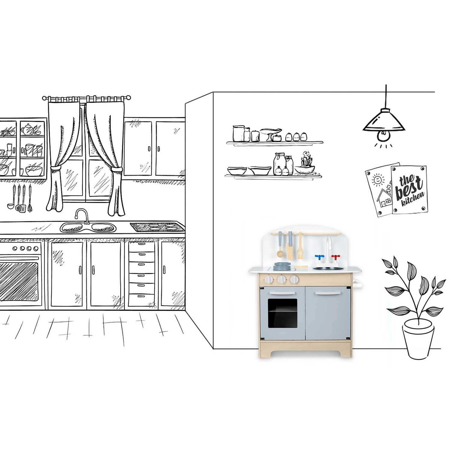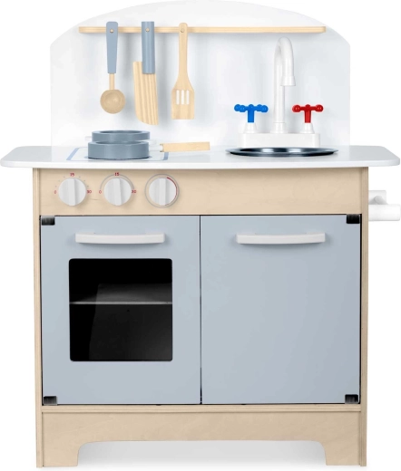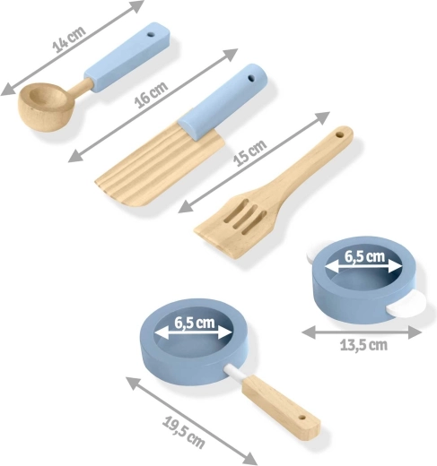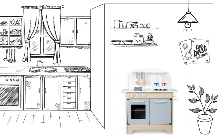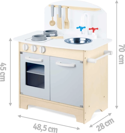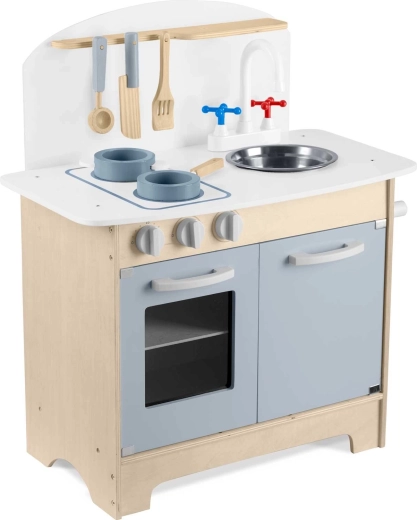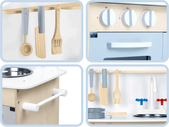 Doordachte opbergruimte zoals een kast voor servies, planken en haakjes voor keukengerei en een houder voor papieren handdoeken zorgt voor orde tijdens het koken. Inclusief accessoireset: pan, steelpan, lepel, spatel en mes. De duurzame houten constructie in een minimalistische retrostijl wordt een elegante decoratie voor de kinderkamer.