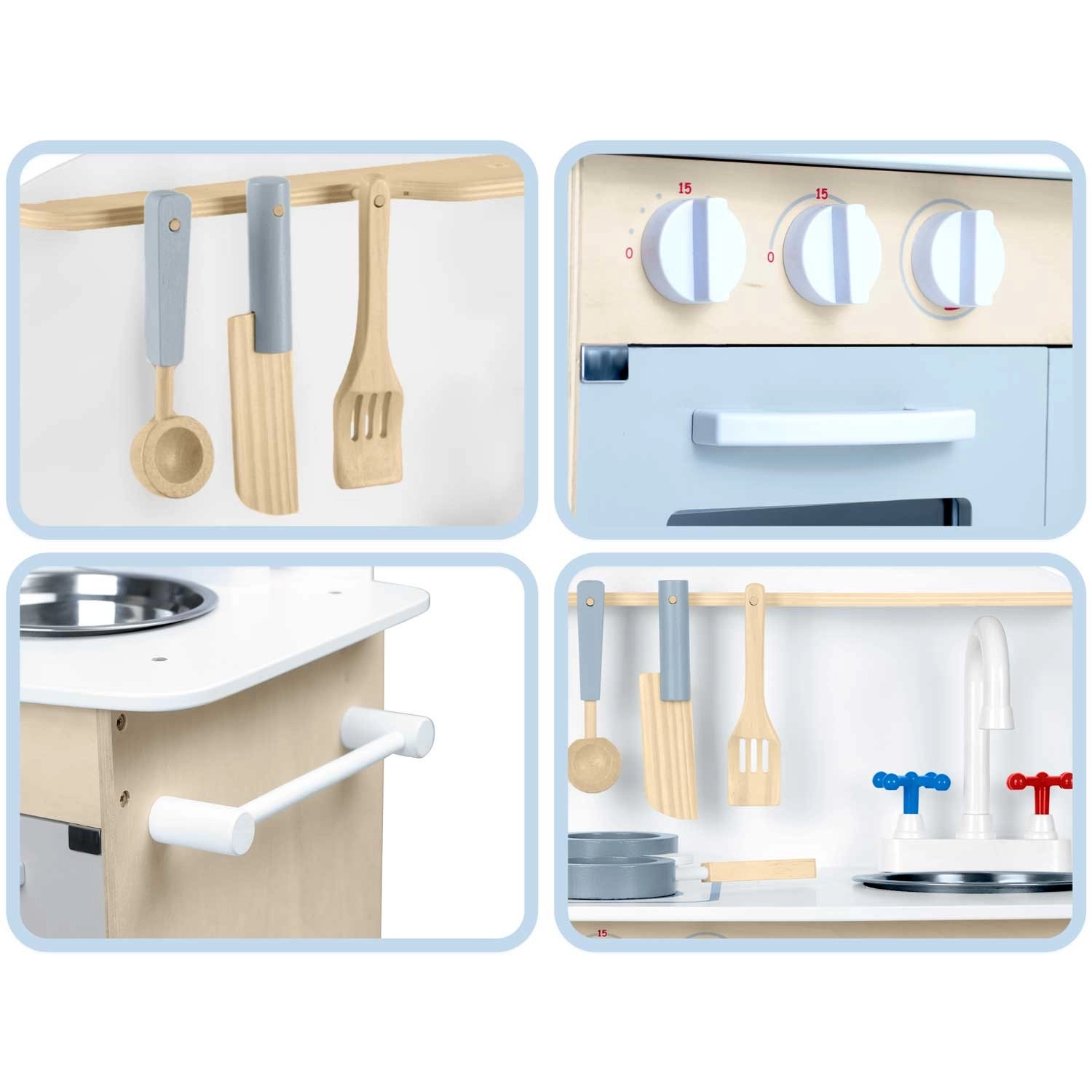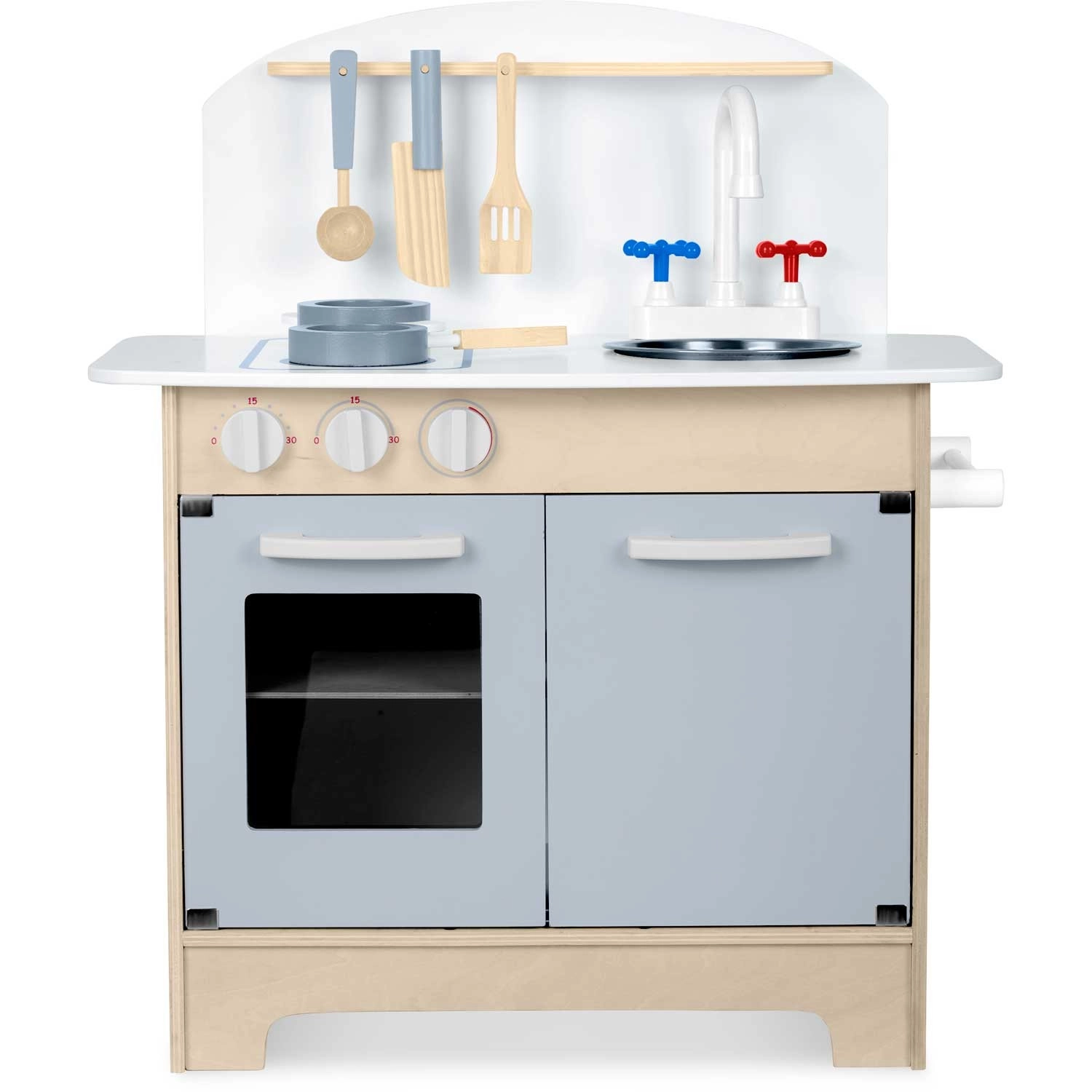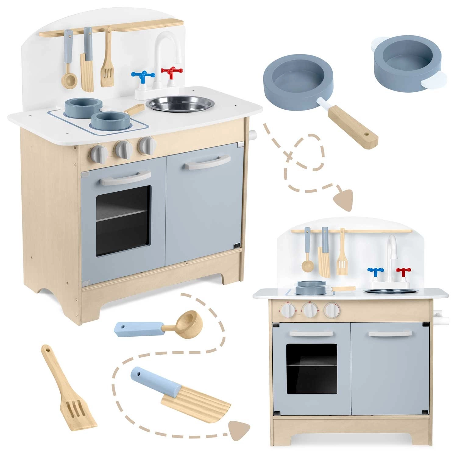 Doordachte opbergruimte zoals een kast voor servies, planken en haakjes voor keukengerei en een houder voor papieren handdoeken zorgt voor orde tijdens het koken. Inclusief accessoireset: pan, steelpan, lepel, spatel en mes. De duurzame houten constructie in een minimalistische retrostijl wordt een elegante decoratie voor de kinderkamer.
