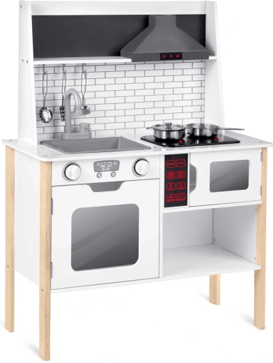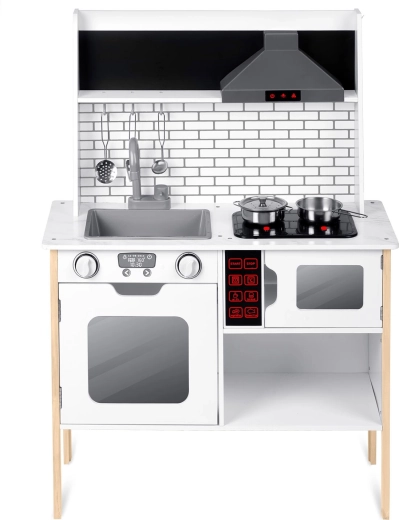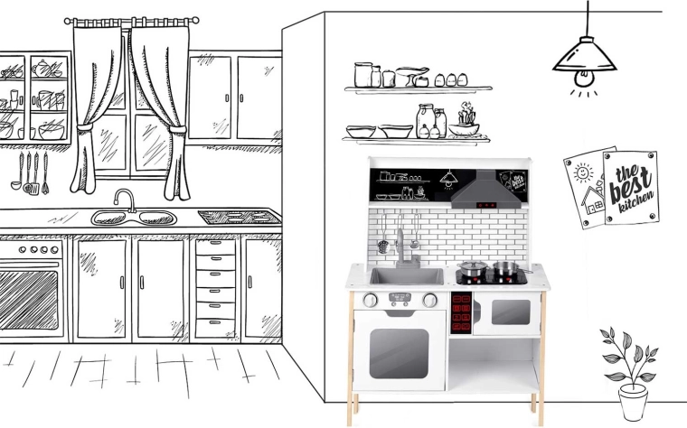 De kinderkeuken RICOKIDS RC-846 is een doordachte houten set die de kinderkamer in een klein restaurant verandert. LED-verlichting in de afzuigkap en magnetron, oplichtende branders met geluid en een bedieningspaneel met geluiden zorgen voor een authentieke kookervaring. De minimalistische, stabiele constructie past perfect in een modern interieur en gaat dankzij de hoogwaardige materialen jarenlang mee.