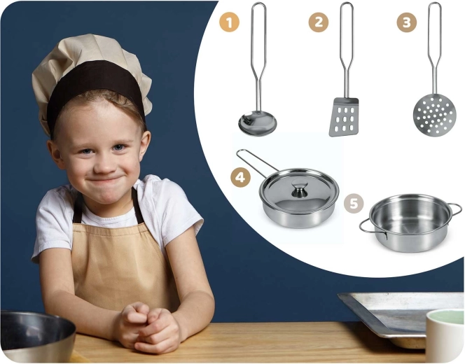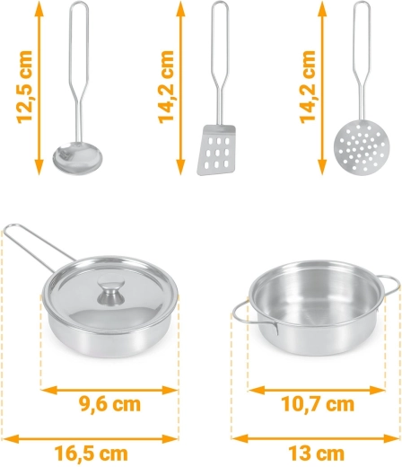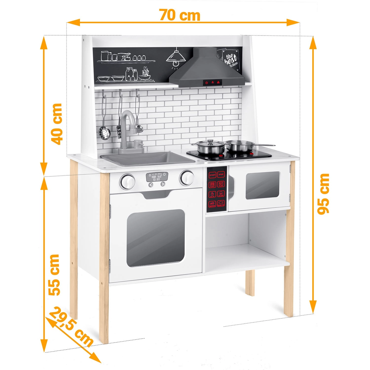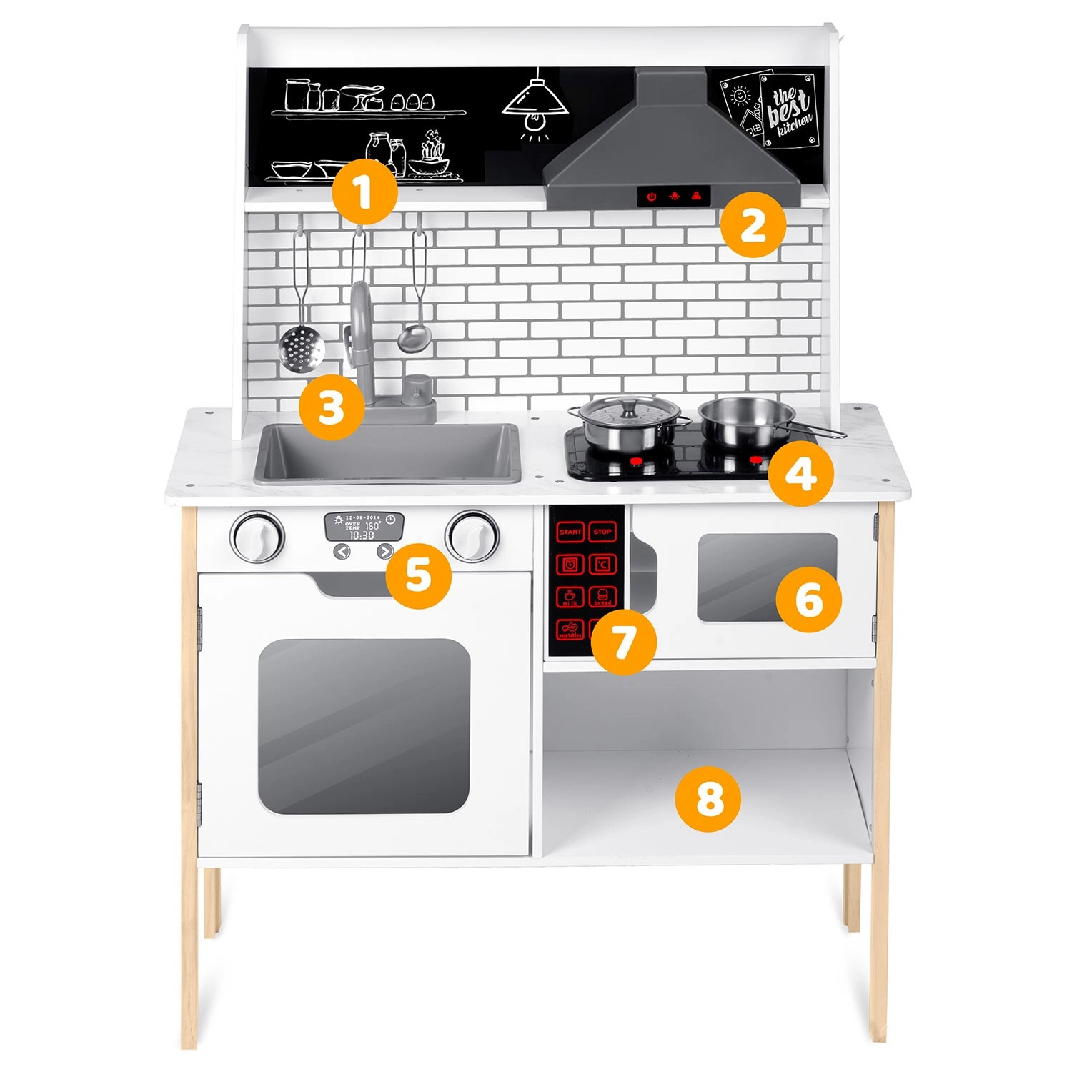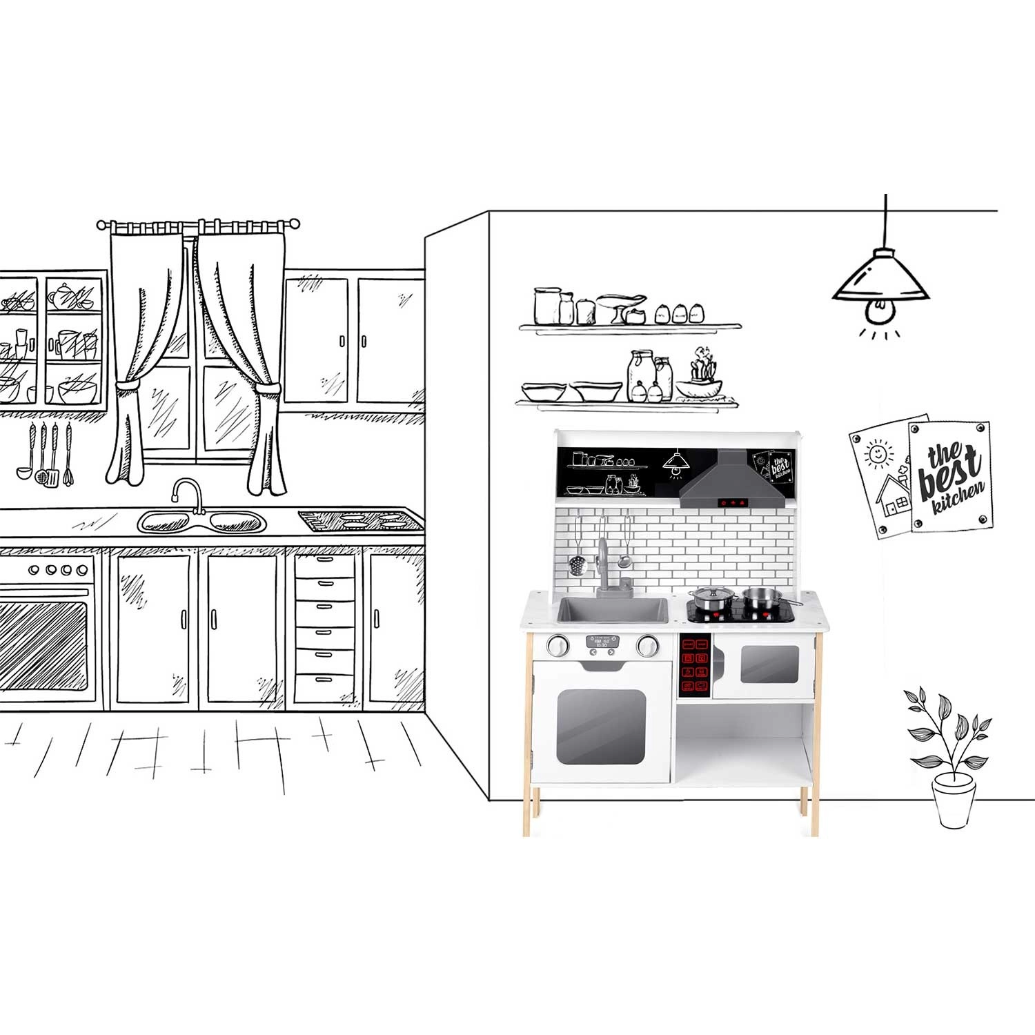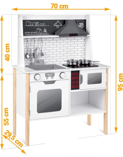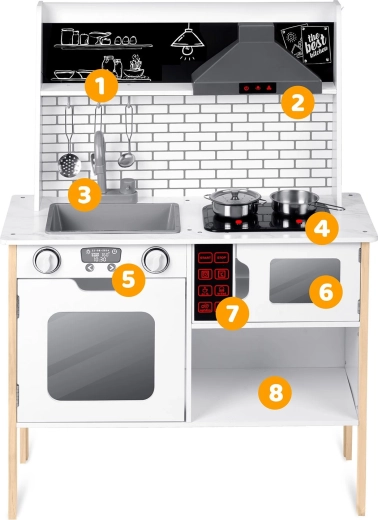 Rijk uitgerust met accessoires: steelpan, kookpan, vergiet, soeplepel, spatel en deksel. Kinderen kunnen met krijt een menu schrijven op het krijtoppervlak, samenwerken en sociale vaardigheden oefenen en op een veilige manier volwassenen nadoen – van afwassen tot bakken in de oven.