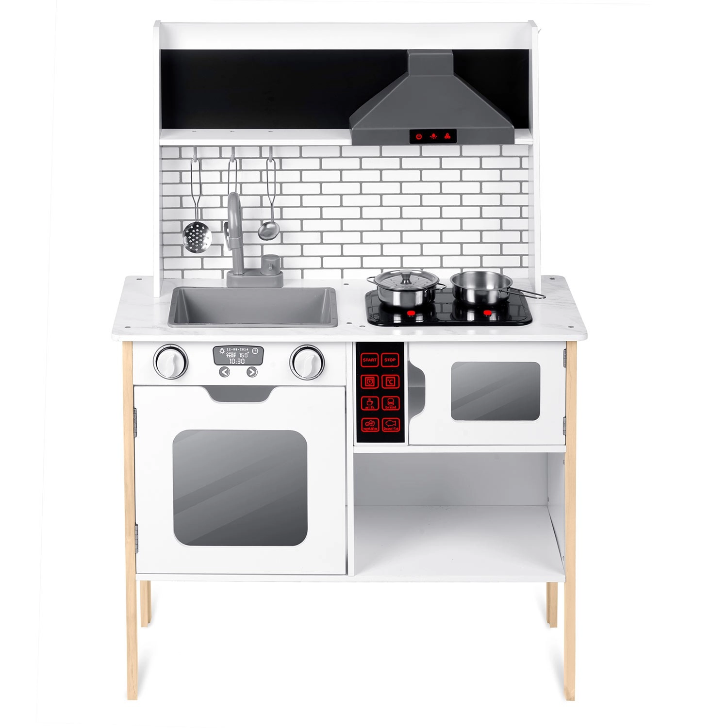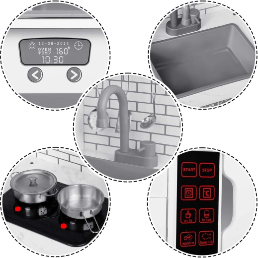 Geïntegreerde LED-verlichting en knoppen op de afzuigkap geven het kookspel een realistische sfeer en leren kinderen de basis van het bedienen van apparaten.