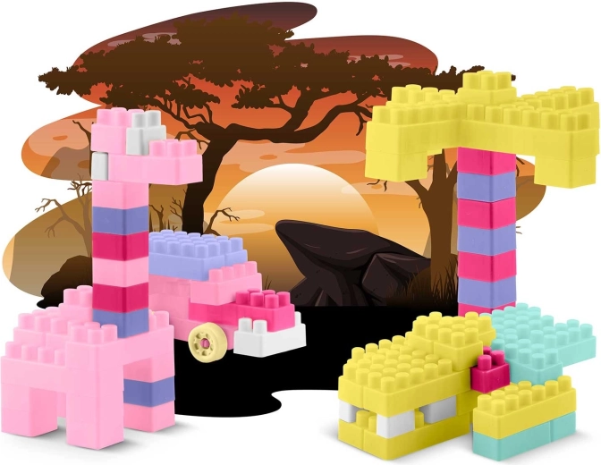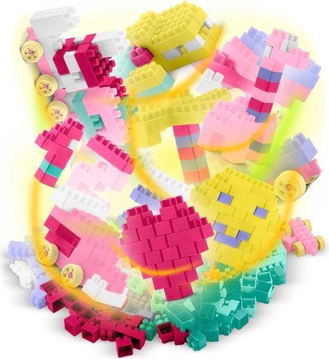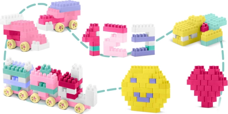 De grote set bouwstenen voor kinderen biedt eindeloze creatieve mogelijkheden – van voertuigen en treintjes tot cijfers, letters, hartjes en smileys. Pastelkleuren, prettige vormen en afgeronde randen zorgen voor veilig en boeiend spel dat verbeeldingskracht en geduld ontwikkelt.