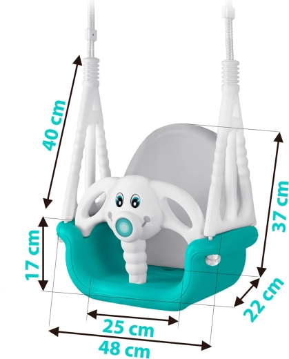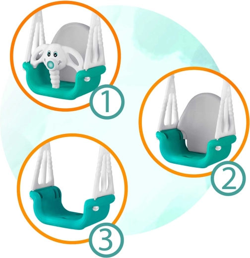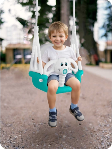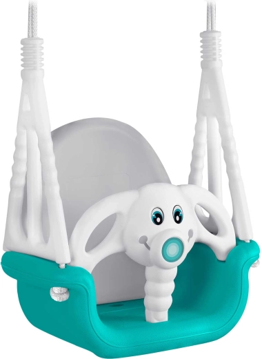 Universele kinder schommel 3-in-1 met een speels olifantmotief groeit met je kind mee van 6 maanden tot 10 jaar. Biedt een hoge rugleuning, voorste veiligheidsbeugel en stevige, verstelbare touwen voor veilig schommelen binnen en buiten. Duurzame waterbestendige kunststof, antislip zitting en certificeringen CE, GS voor gemoedsrust van ouders.