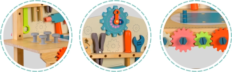 Het frontpaneel met kleurrijke tandwieloverbrengingen en talrijke schroeven en moeren ontwikkelt de fijne motoriek en coördinatie. Kinderen trainen hun logisch denken bij het koppelen van de wielen en oefenen hun greep tijdens het vastdraaien.