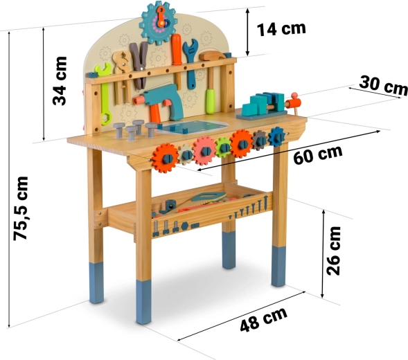 Deze houten werkbank met een uitgebreide set gereedschap biedt kinderen hun eigen miniwerkplaats. Dankzij de draaiende tandwielen, de functionele bankschroef en de vele schroeven en moeren leren kleine doe-het-zelvers aandraaien, schroeven en eenvoudige constructies bouwen. Doordachte opbergplekken en een ophangbord houden alle onderdelen binnen handbereik.
