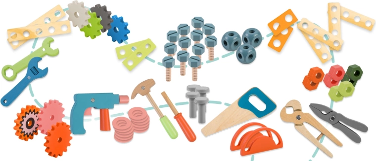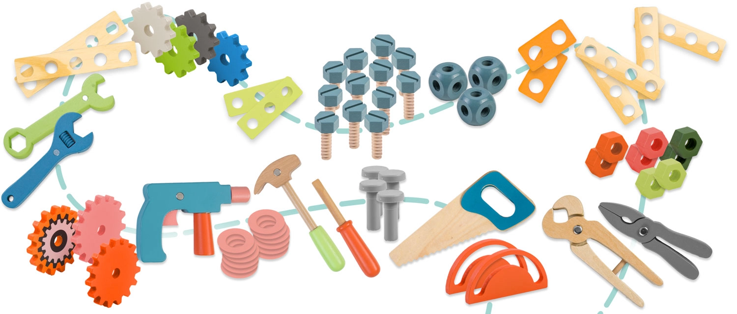 - Realistisch spel: hamertje, schroevendraaier, sleutels, zaag, tang, boor en andere accessoires.