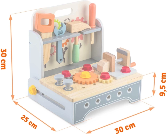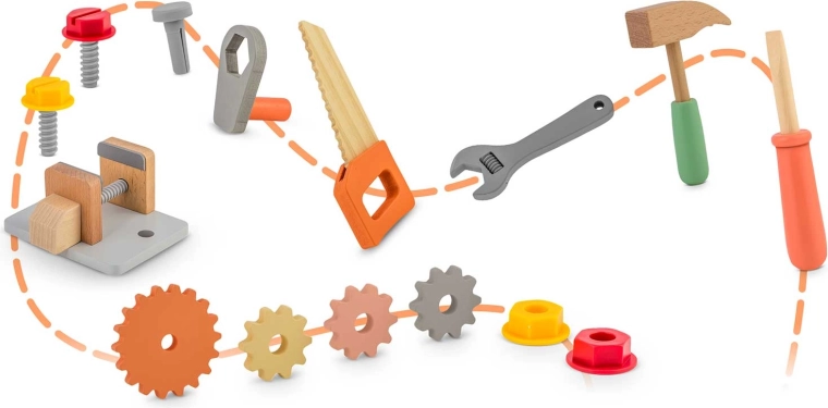 Hamer, schroevendraaier, sleutel en zaag hebben hun plek op het paneel en de plank. Veilig en duurzaam uitgevoerd, ideaal voor kleine handjes.