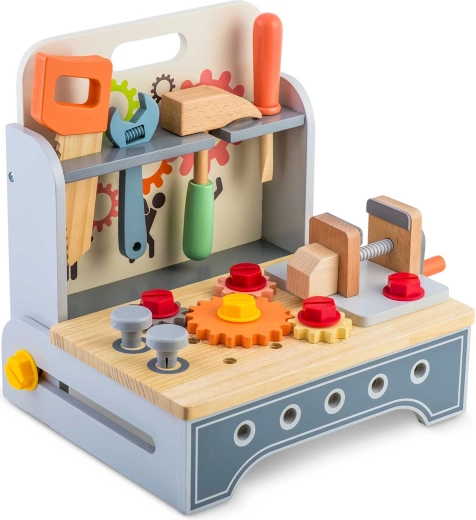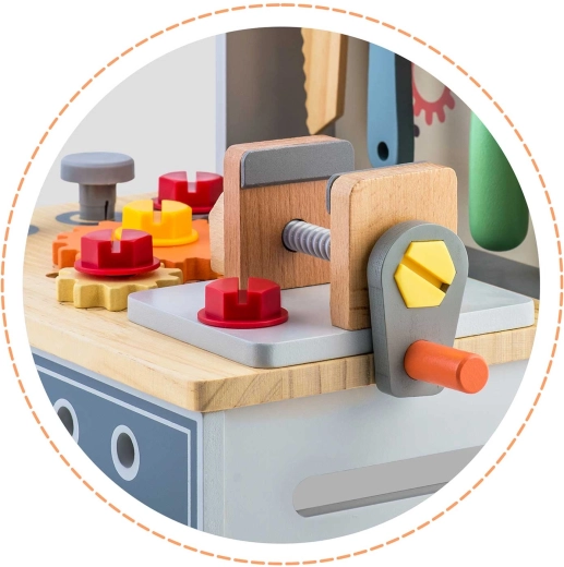 De houten kinderwerkbank RICOKIDS biedt volop mogelijkheden om te ontdekken en te spelen. Kleine doe-het-zelvers kunnen schroeven, aandraaien, zagen en klemmen in de functionele bankschroef, verbonden tandwielen laten draaien en gereedschap opbergen op het overzichtelijke paneel met silhouetten. Hoogwaardig hout, gladde randen en veilige verf garanderen duurzaamheid en veiligheid bij dagelijks gebruik.