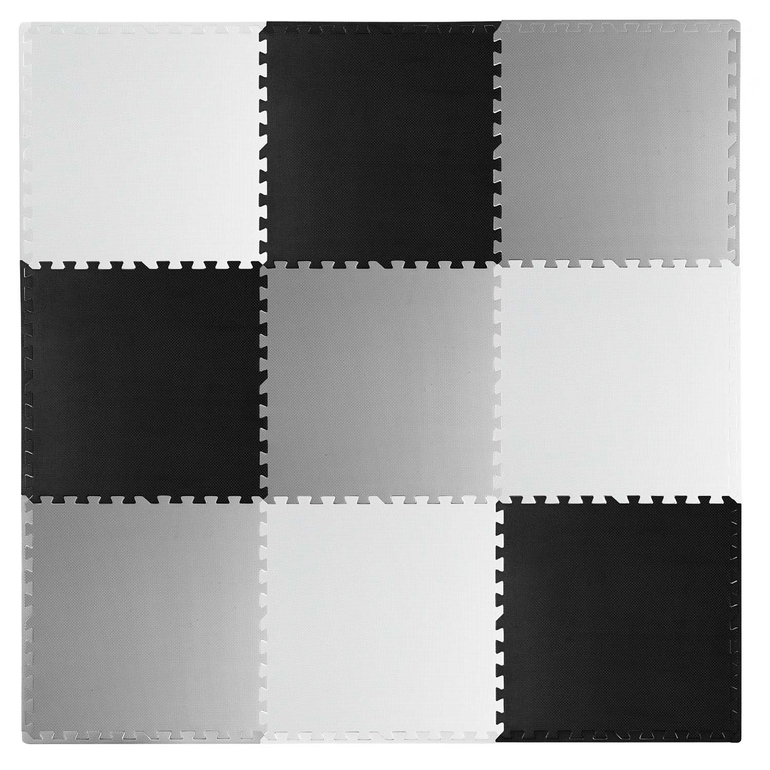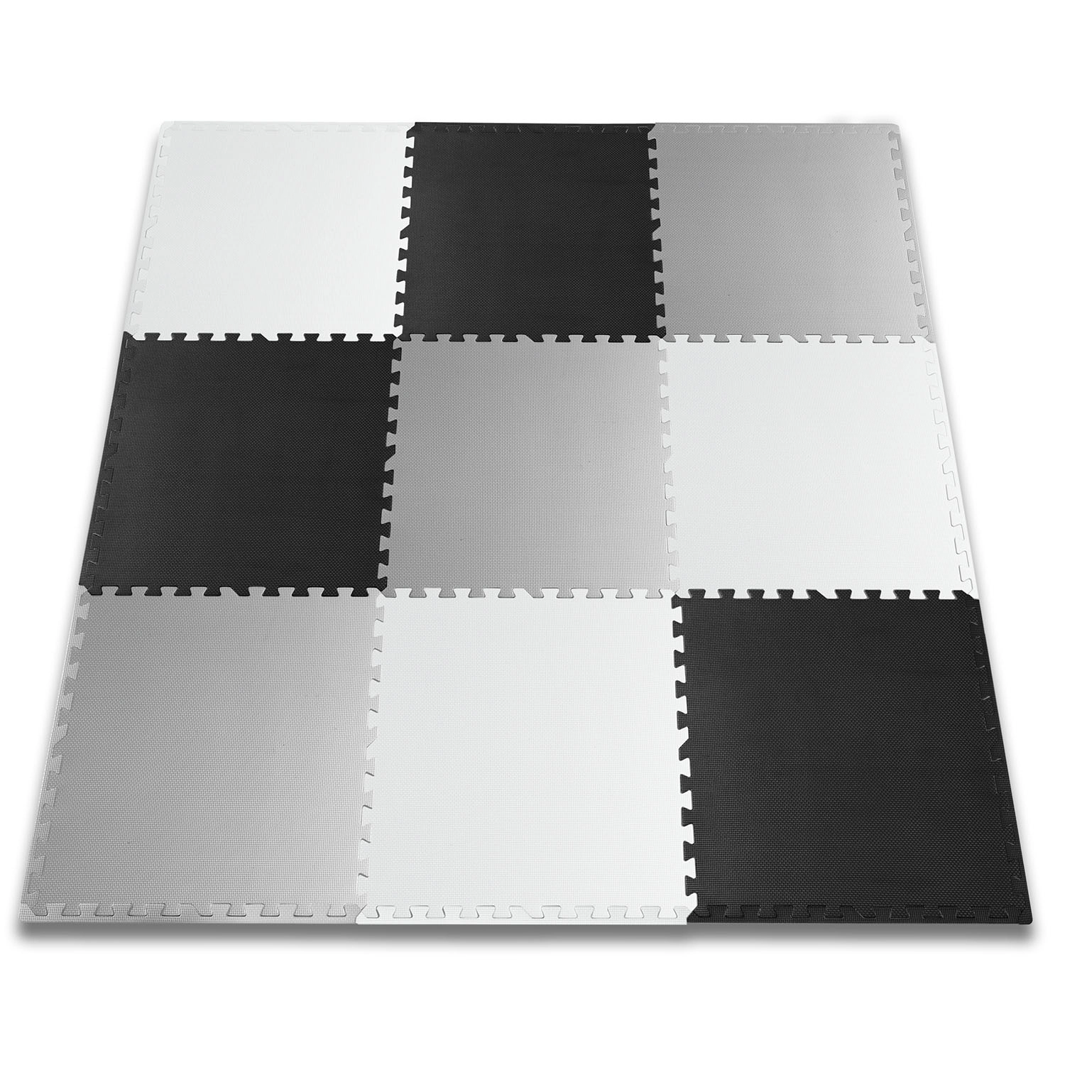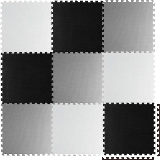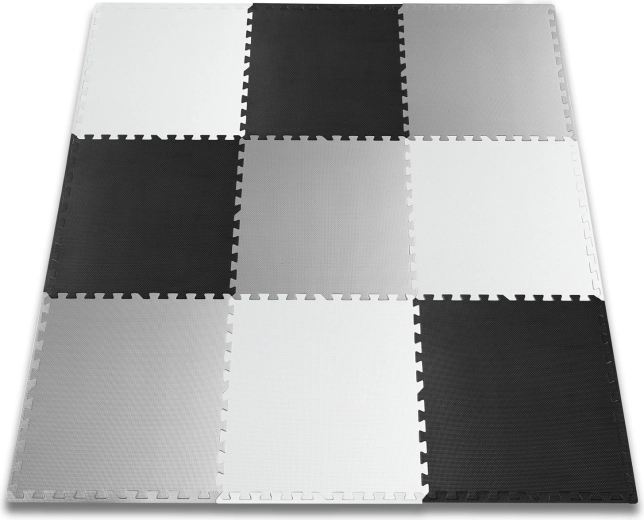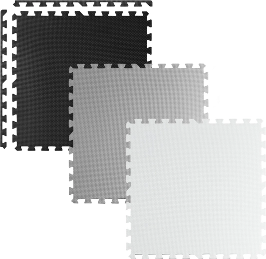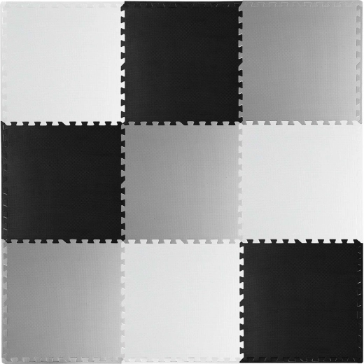 Delen van 60 × 60 cm verbindt u tot diverse vormen: schaakbord, kleinere matten of 3D-constructies. Pas het oppervlak eenvoudig aan naar behoefte.