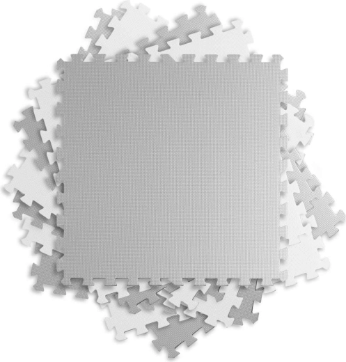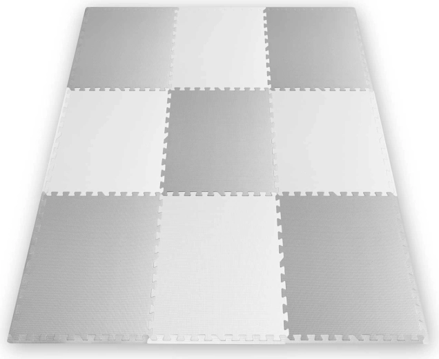 Dankzij de puzzelranden kan de mat eenvoudig worden uitgebreid, in verschillende vormen worden gelegd en qua uiterlijk worden gewijzigd naar een elegante wit-grijze schaakbord. Het oppervlak is antislip voor veilige beweging en het onderhoud is zeer eenvoudig – afnemen met een vochtige doek is voldoende. De mat is ook geschikt voor allergiepatiënten, omdat hij geen stof of huisstofmijt opneemt.