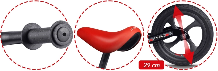 Voor veiligheid en comfort zijn er antisliphandvatten met stoppers voor een zekere grip, een zacht ergonomisch zadel voor langere ritten en een doordachte geometrie voor gemakkelijk opstappen. Rijden op de loopfiets ontwikkelt coördinatievaardigheden, balans en concentratie, en versterkt zo het zelfvertrouwen van jonge rijders.