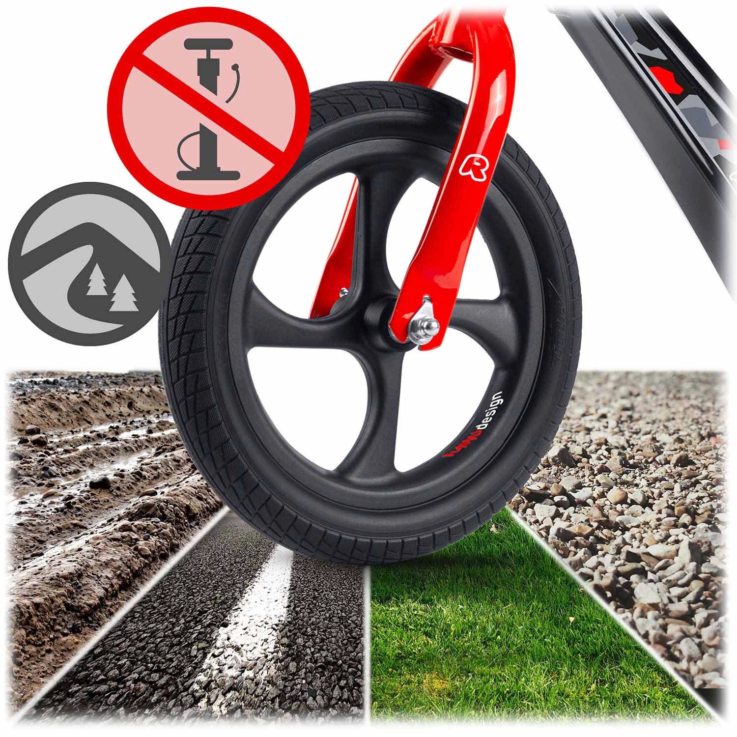 Duurzame 12" EVA-schuimwielen hoeven niet te worden opgepompt, raken niet lek en dempen oneffenheden uitstekend. Ze zijn eenvoudig schoon te maken en blijven stil op diverse ondergronden.