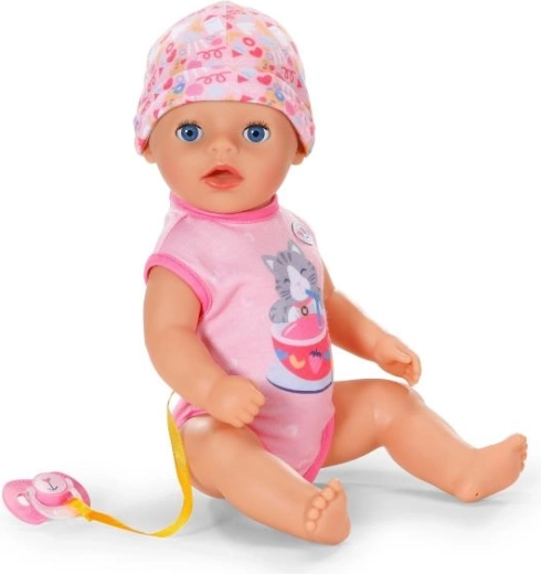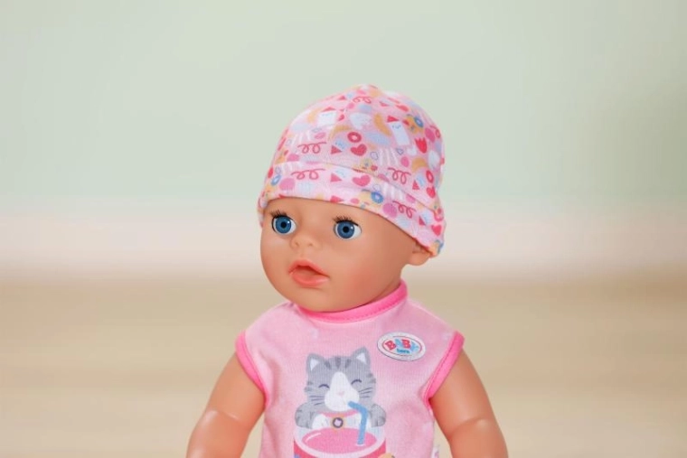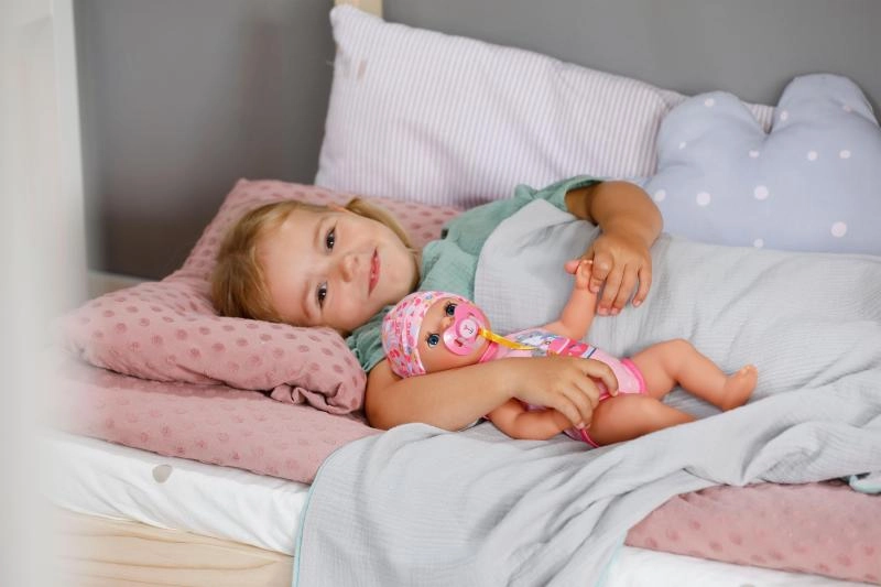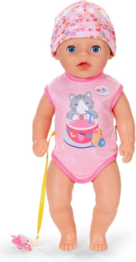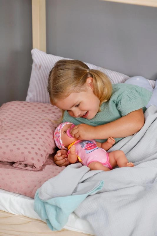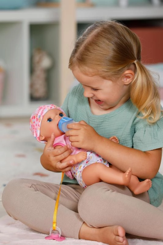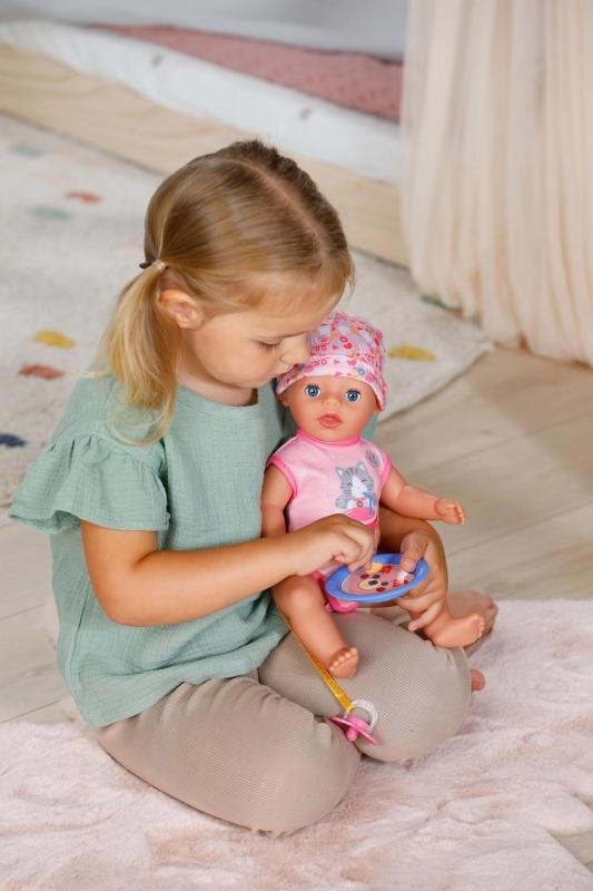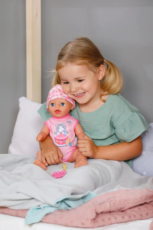 De speen, bevestigd aan het boxpakje met een schattig kattenmotief, maakt het mogelijk de pop haar ogen te laten openen en sluiten ook terwijl ze zit. Zodra ze in bed wordt gelegd, sluit ze haar ogen vanzelf, alsof ze echt in slaap valt. Bewegende armen en benen en een draaibaar hoofd maken aan- en uitkleden gemakkelijk, zodat kleine verzorgers alles zelf kunnen doen.
