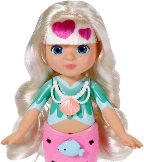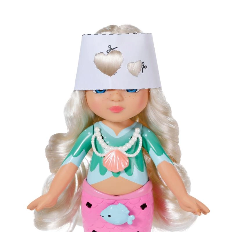 Ontdek de wereld van creëren met de pop BABY born Glam Up zeemeermin Sparkle, die dol is op veranderingen in look en kleur. Dankzij lang blond haar dat van kleur verandert in de zon, opklikbare versieringen, textiele accessoires en een schattig dierenvriendje creëren kinderen moeiteloos originele stijlen van top tot staartvin. Perfect voor creatief haren stylen, versieren en fantasierijk spel.