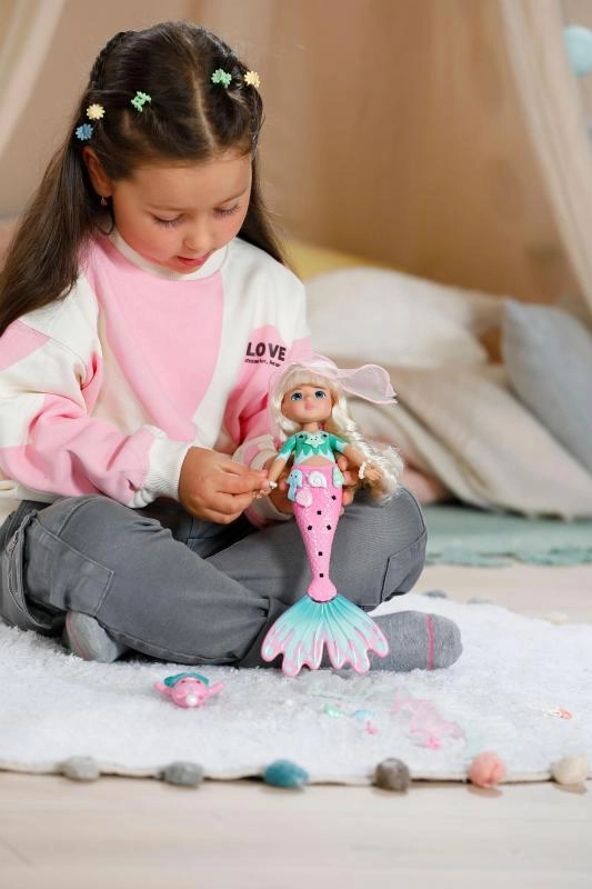 Inclusief textiele accessoires, gekleurde opklikbare versieringen, een inspirerende brochure en een schattig diertje met een afneembare vin. Combineer, clip vast, versier en style – iedere keer anders en origineel. De pop is ideaal voor de ontwikkeling van de fijne motoriek, creativiteit en het vertellen van eigen onderwaterverhalen.