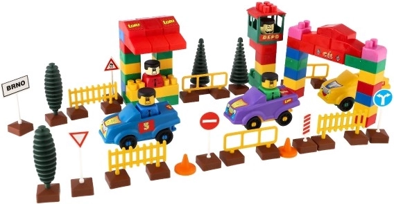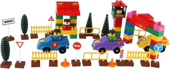 De set bevat realistische elementen die een verkeersomgeving voor spel nabootsen, zoals auto's, bomen en verkeerstekens.