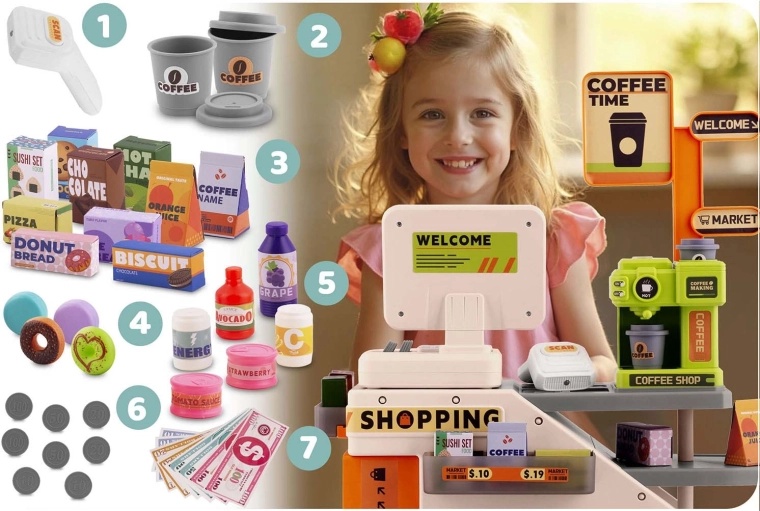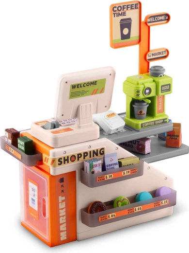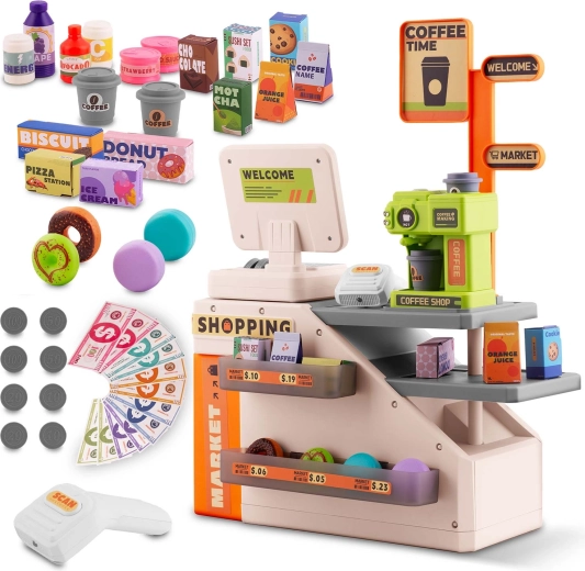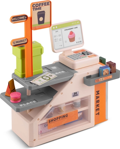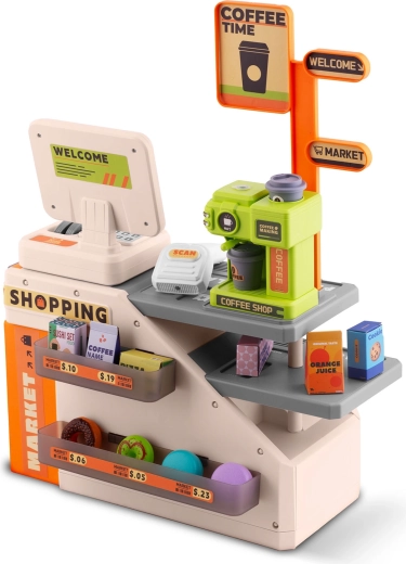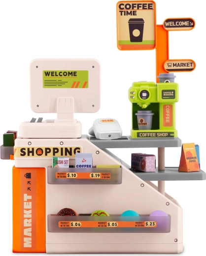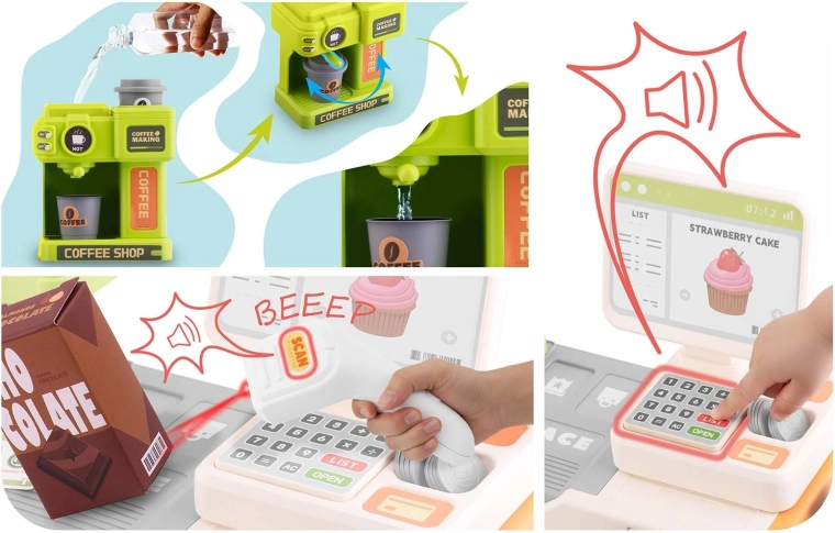 Deze kleurrijke en functionele kassa met café motiveert kinderen om sociale rollen te ontdekken en stimuleert de verbeelding. Dankzij de scanner met rode LED, knoppen met geluiden en de espressomachine die met water gevuld kan worden voor “echte” koffie, beleven kinderen realistisch winkels- én baristaspel.