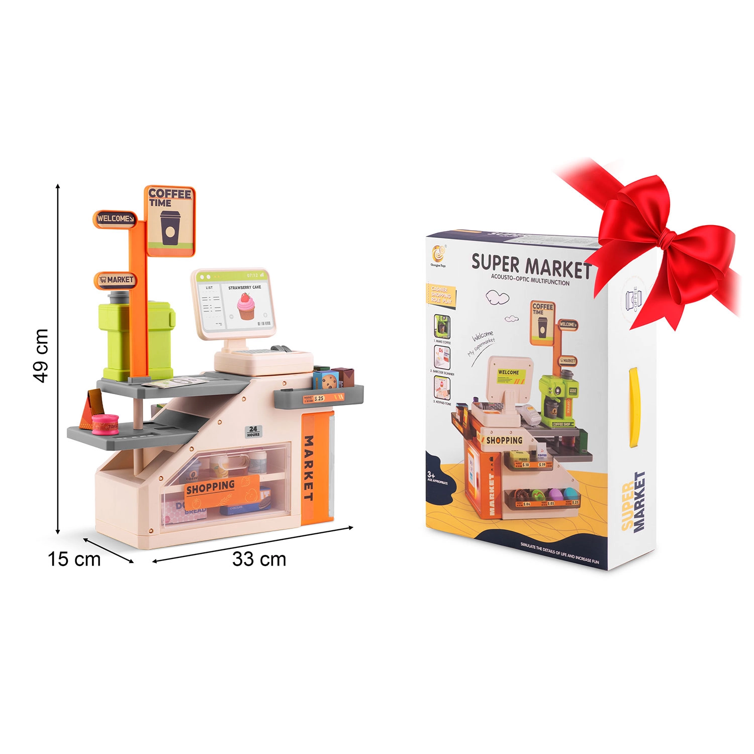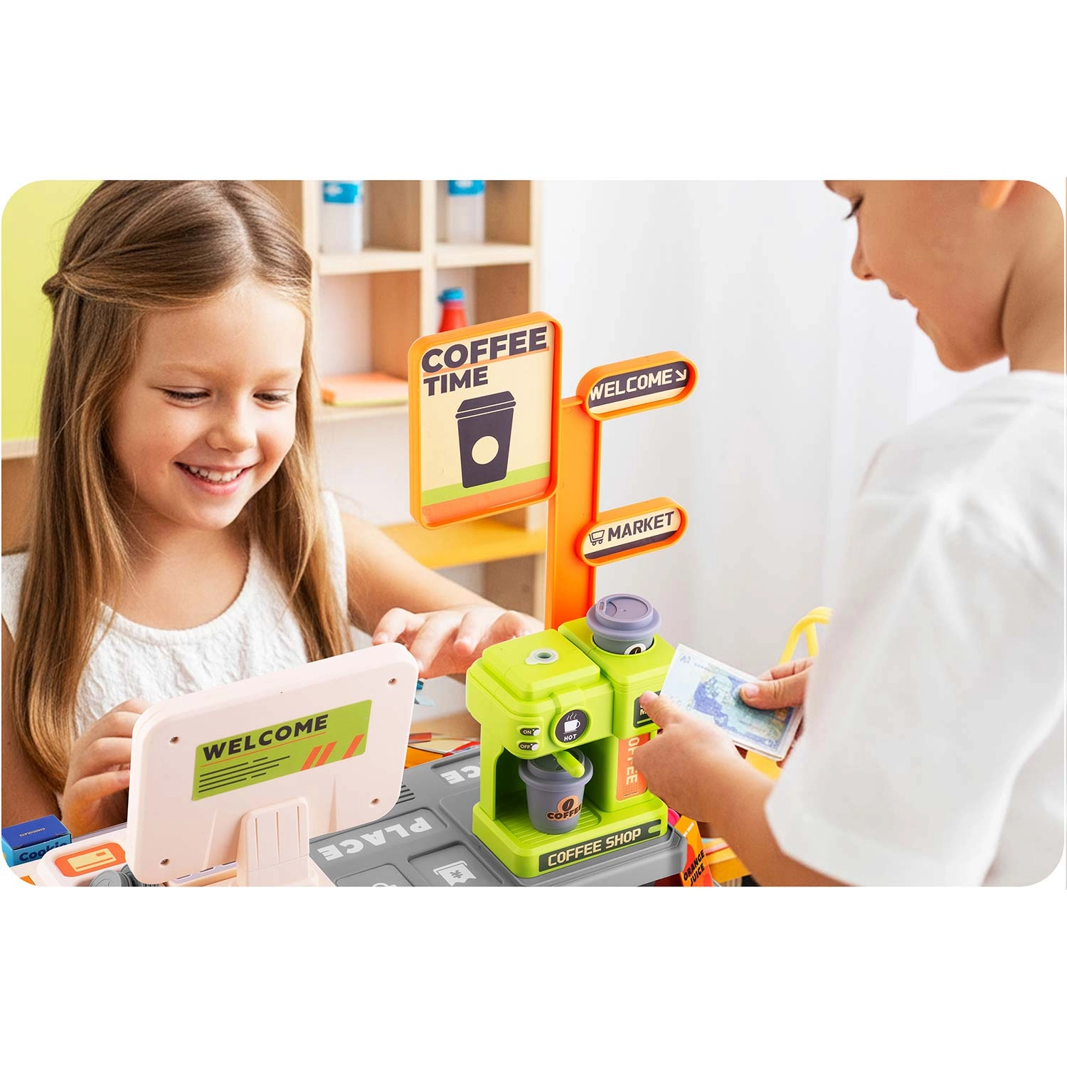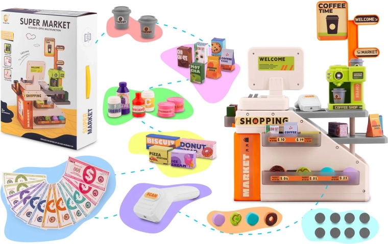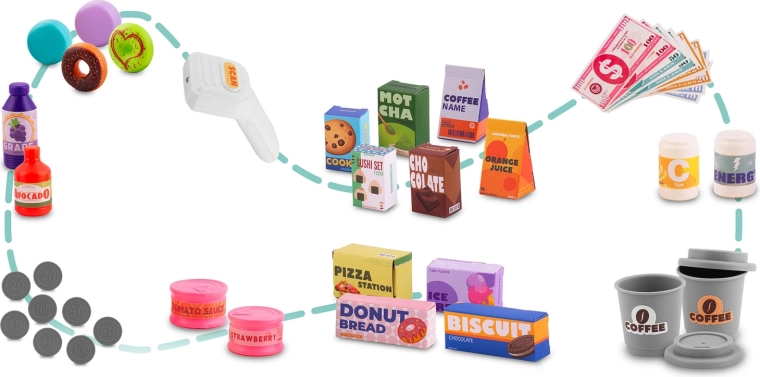 De set bevat veel accessoires: papieren bankbiljetten, plastic munten, voedseldoosjes, koekjes, blikjes en flesjes. De open te klappen toonbank en opbergvakken helpen alles netjes te houden, terwijl de opvallende kleuren en het kassadisplay de aandacht trekken en spelenderwijs leren ondersteunen.