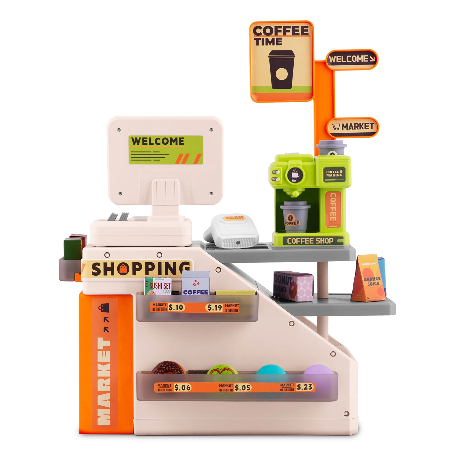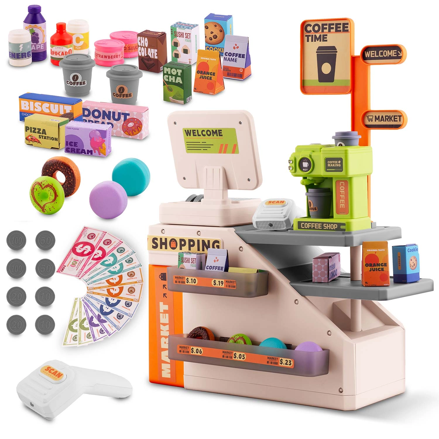 Kinderen kunnen goederen “scannen” zoals in een echte winkel. De scanner licht rood op en bij het indrukken van de knop klinkt een geluid dat de authenticiteit van het spel vergroot.