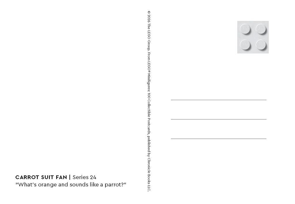 Ontdek een stijlvolle collectie van 100 verzamelbare ansichtkaarten met iconische LEGO minifiguren. Elke kaart biedt een hoogwaardige kleurenprint; op de achterzijde vind je de naam van het figuurtje, de serie en een grappige officiële slogan. Ideaal om te versturen, tentoon te stellen en te decoreren – een plezier voor elke LEGO-fan en -verzamelaar.