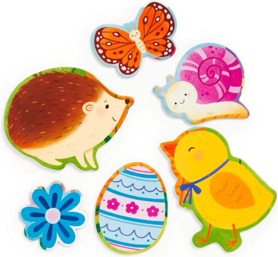 Schattige vloerpuzzel met een lentemand vol dieren en bloemen die kleine bouwers en hun ouders zal bekoren. Grote, stevige stukjes liggen goed in de hand en dankzij de zes speciaal gevormde stukken is puzzelen nog leuker. Na het leggen ontstaat een kleurrijke scène die uitnodigt tot verhalen vertellen en de woordenschat vergroot.