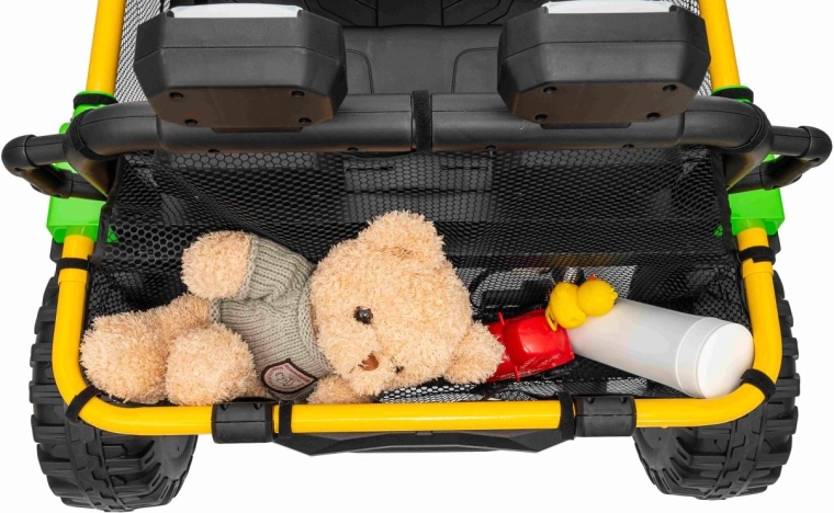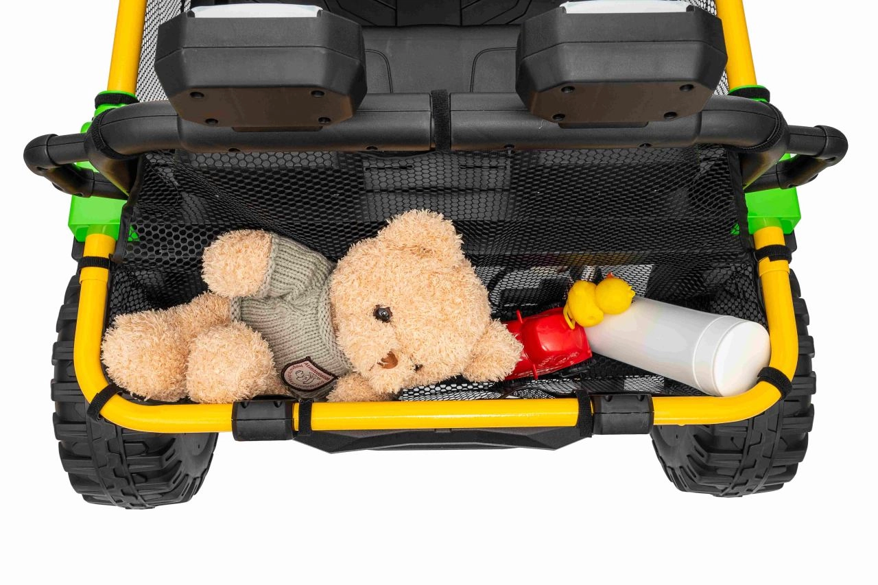 Het interieur biedt een dubbele zitplaats met gordels, een overzichtelijk cockpit en een audiopaneel met Bluetooth, USB en MP3. Soepele start, keuze vooruit/achteruit en twee rijsnelheden maken elke rit veilig en comfortabel. De achterste opbergmand biedt plaats aan speelgoed en snacks voor onderweg.