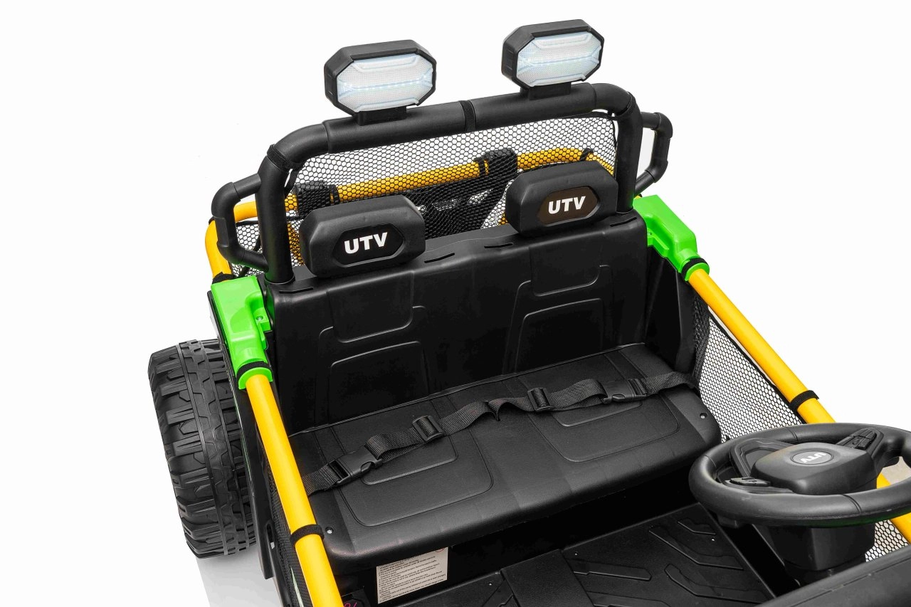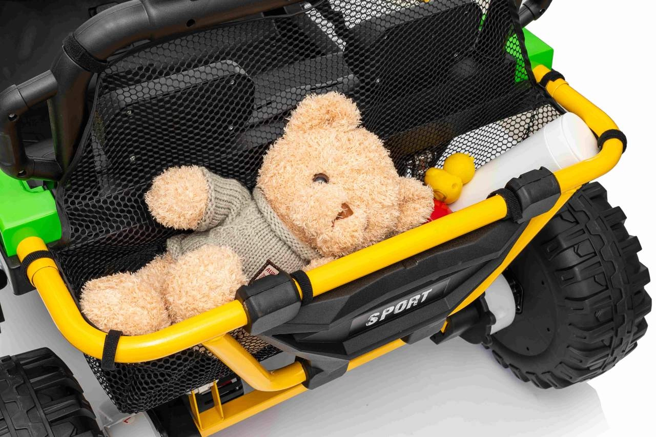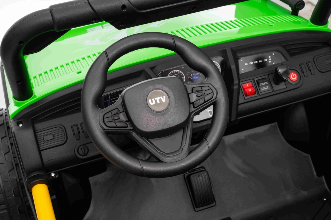 Robuuste elektrische kinderauto in UTV-stijl met een krachtige aandrijving 2×80 W, een 24 V 9 Ah accu en terreinwaardige EVA-banden voor soepel rijden buiten. Twee zitplaatsen met veiligheidsgordels, 2,4 GHz afstandsbediening met Stop-knop en LED-verlichting zorgen voor plezier én veiligheid. Het audiopaneel met Bluetooth/USB/MP3 en een praktische achtermand maken de uitrusting voor kleine avonturiers compleet.